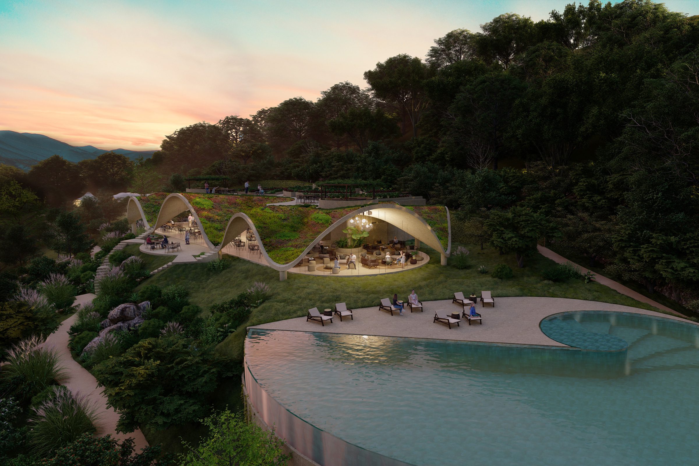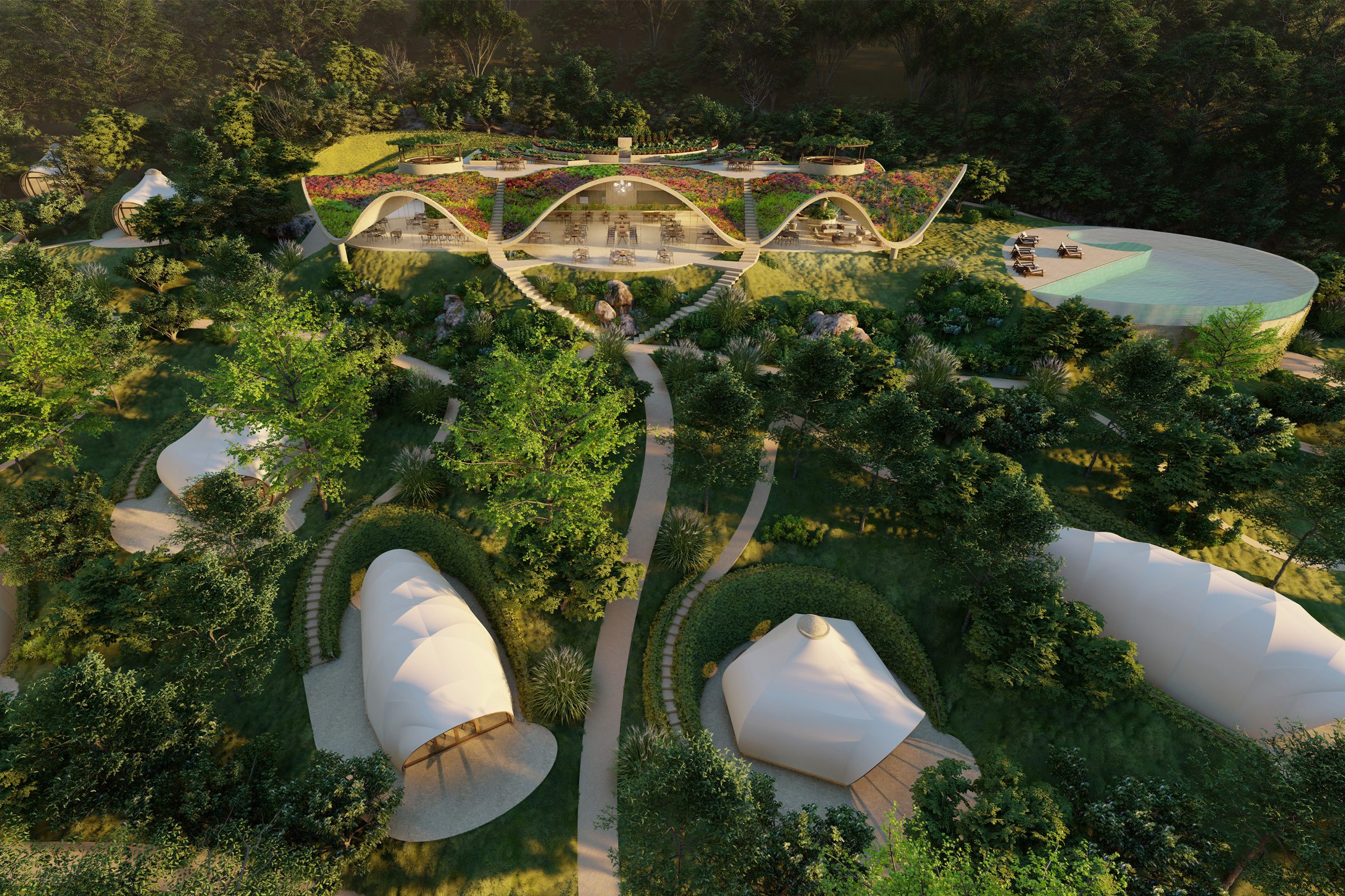 The Nomadic Escapes camp includes 14 branded residences, 20 luxury tents with en-suite bathroom, a reception building and landscaped arrival experience, an iconic restaurant with a rooftop organic vegetable garden, a swimming pool and pool deck, Deep Nature Spa located below the pool, an activity center with strong focus on water sports.