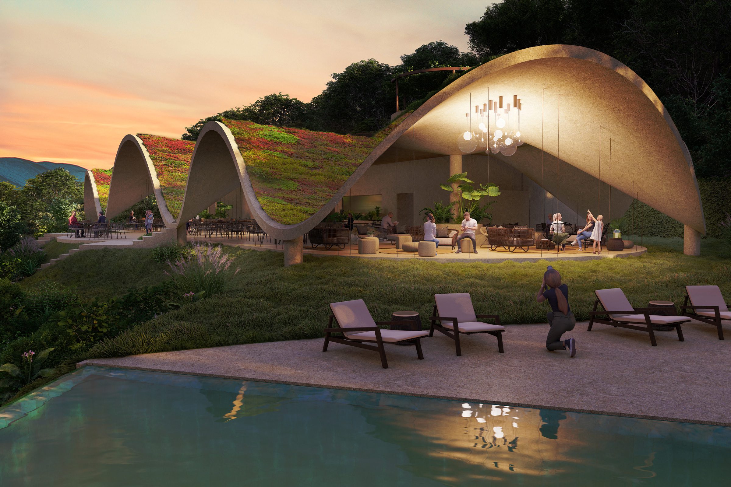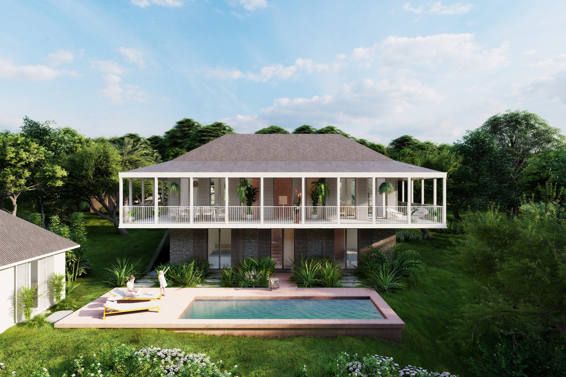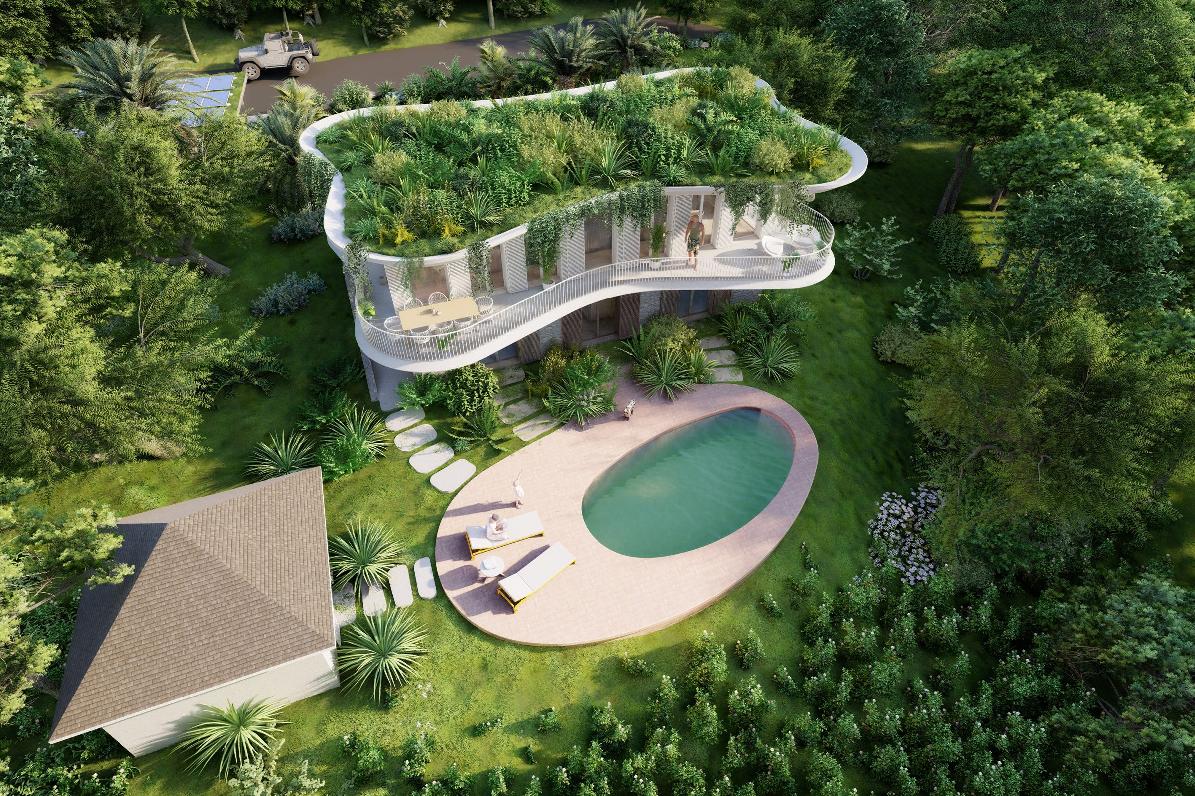 The two types of villas offer very different environments – Guetali Villas offer a more traditional experience with their shingle-covered gabled roofs, while Rivulet Villas with their green roofs allow owners to immerse themselves in their tropical surroundings.