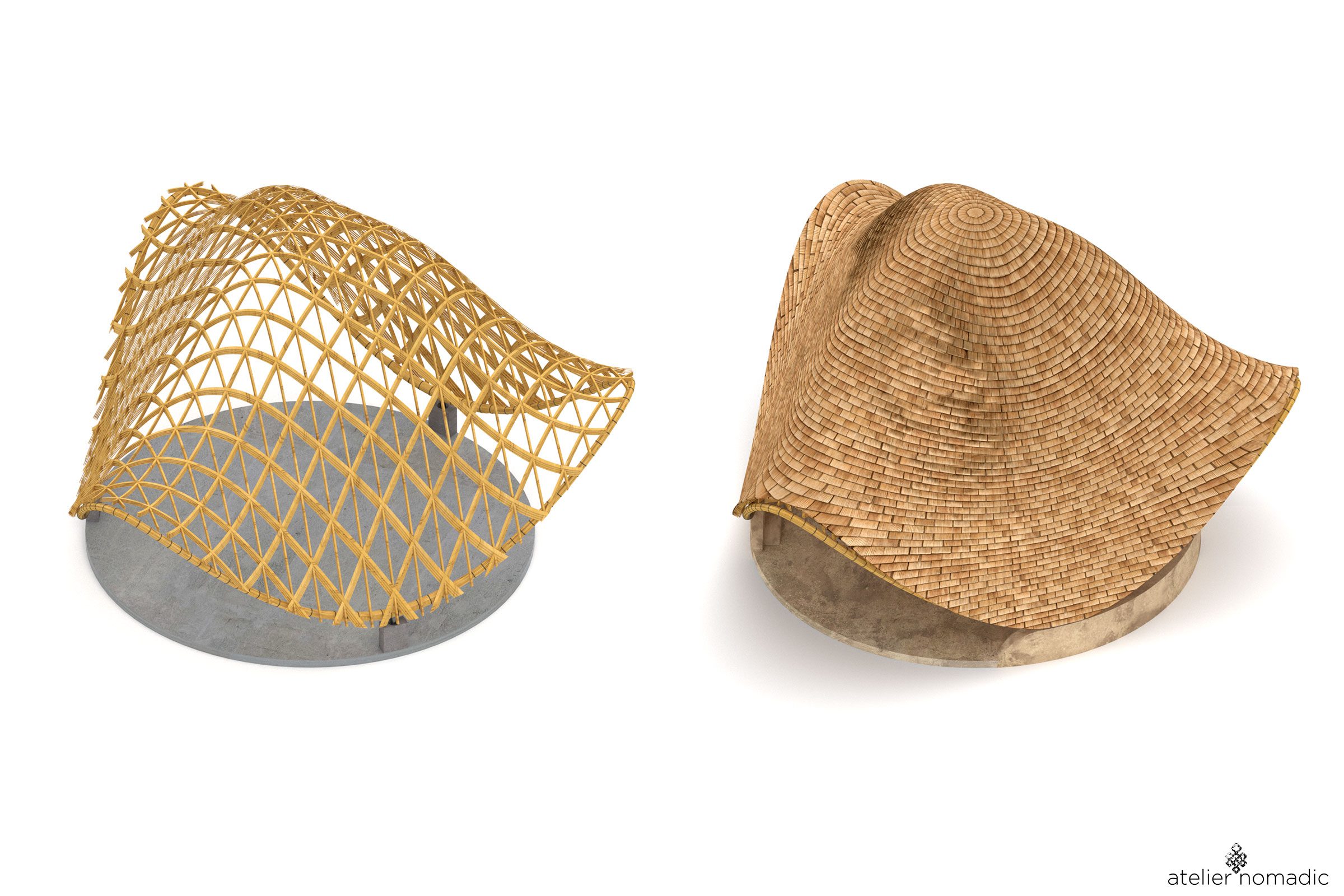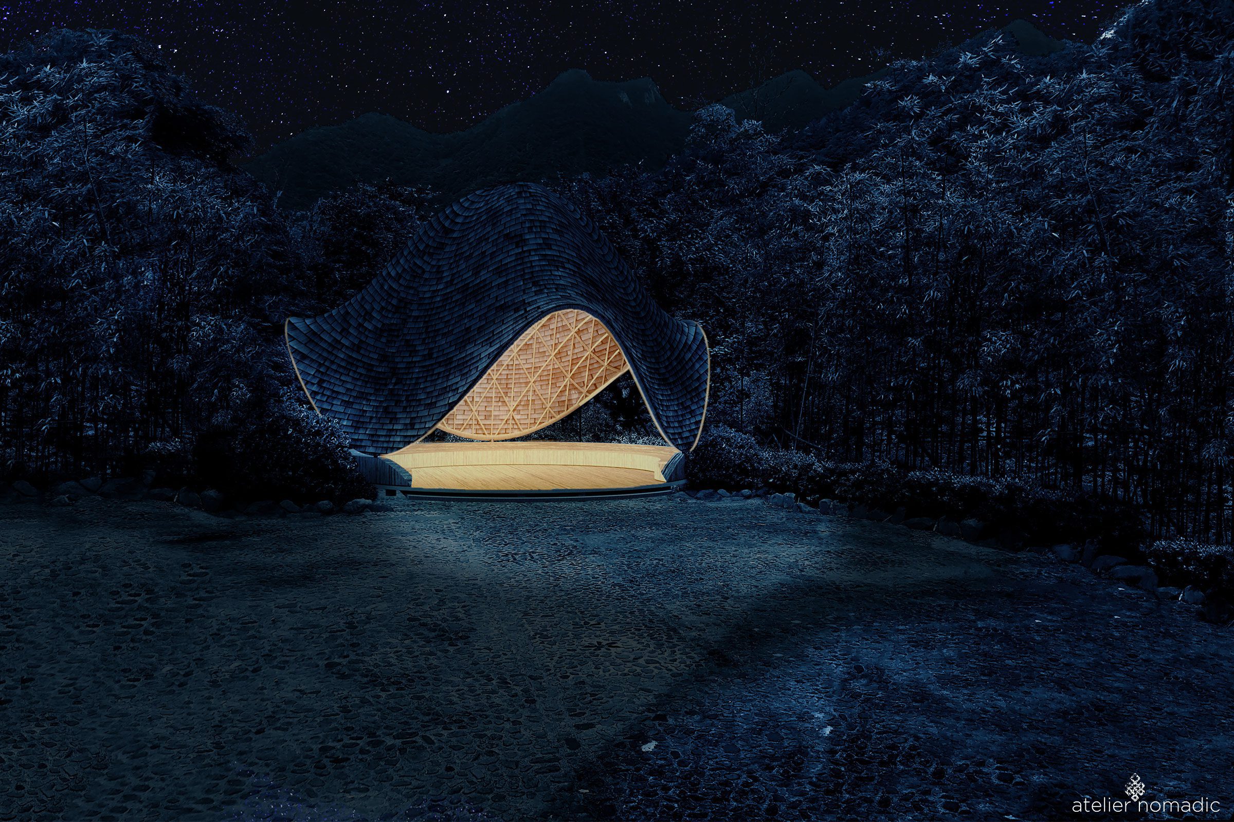 Inspired by the woven bamboo Chinese hat, the design blends the more traditional handicrafts with a contemporary architecture that mirrors mountains in the background.