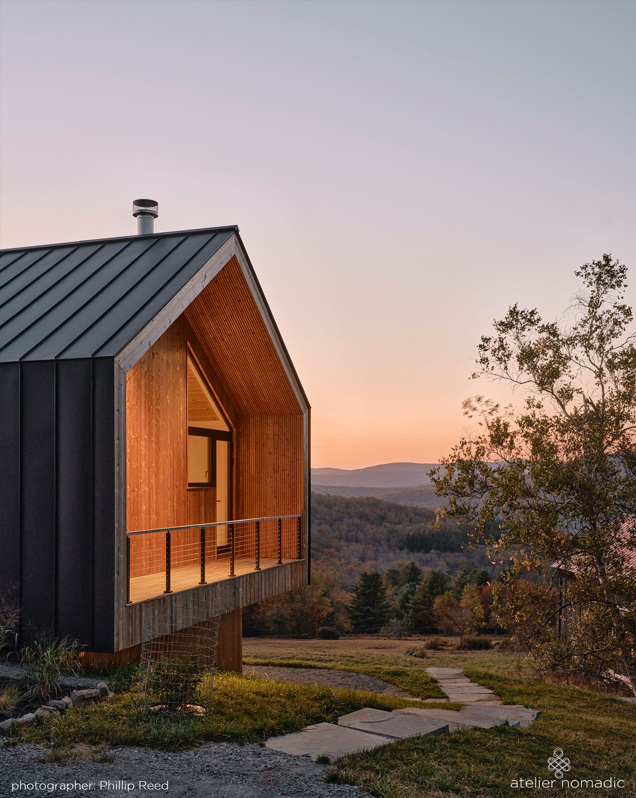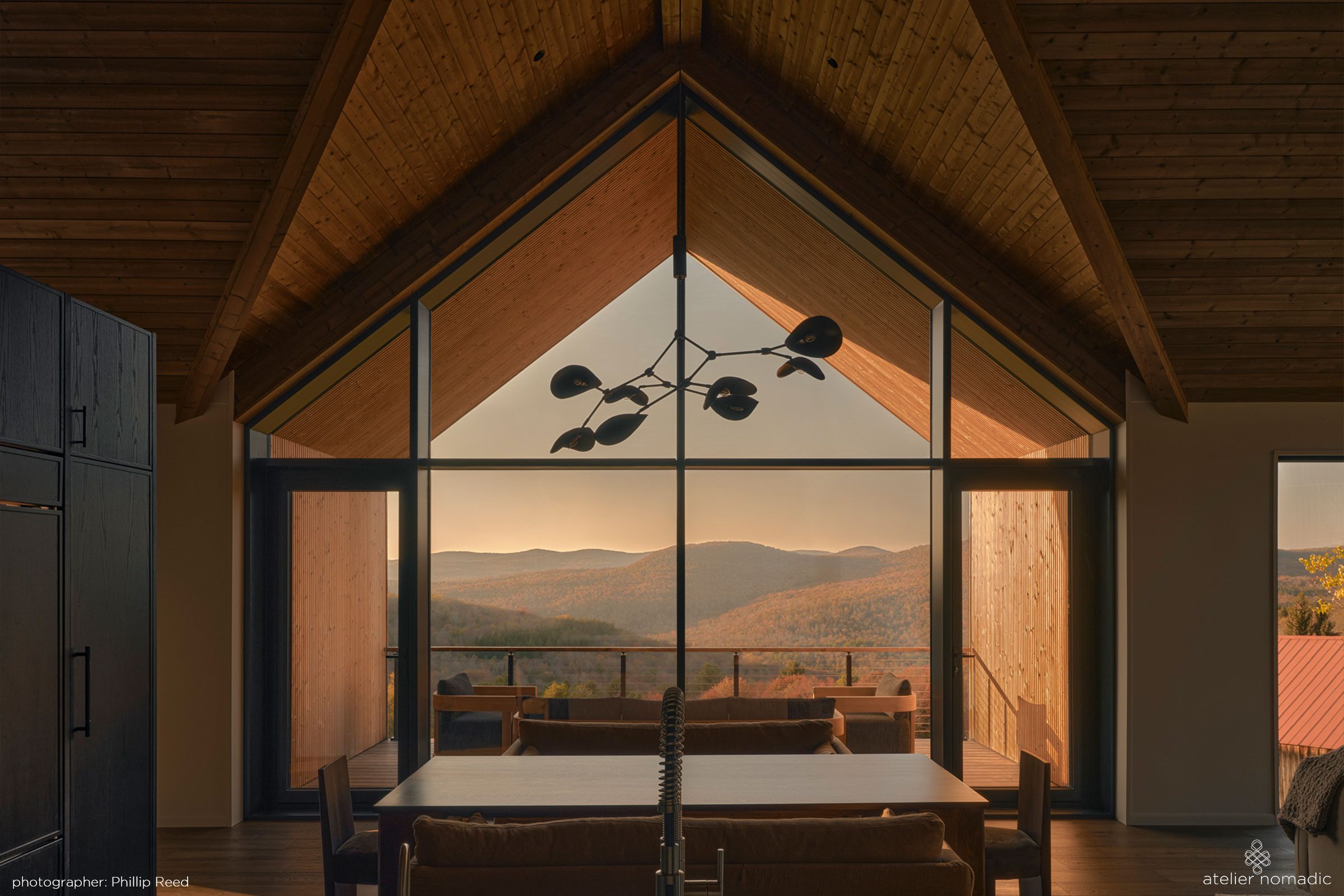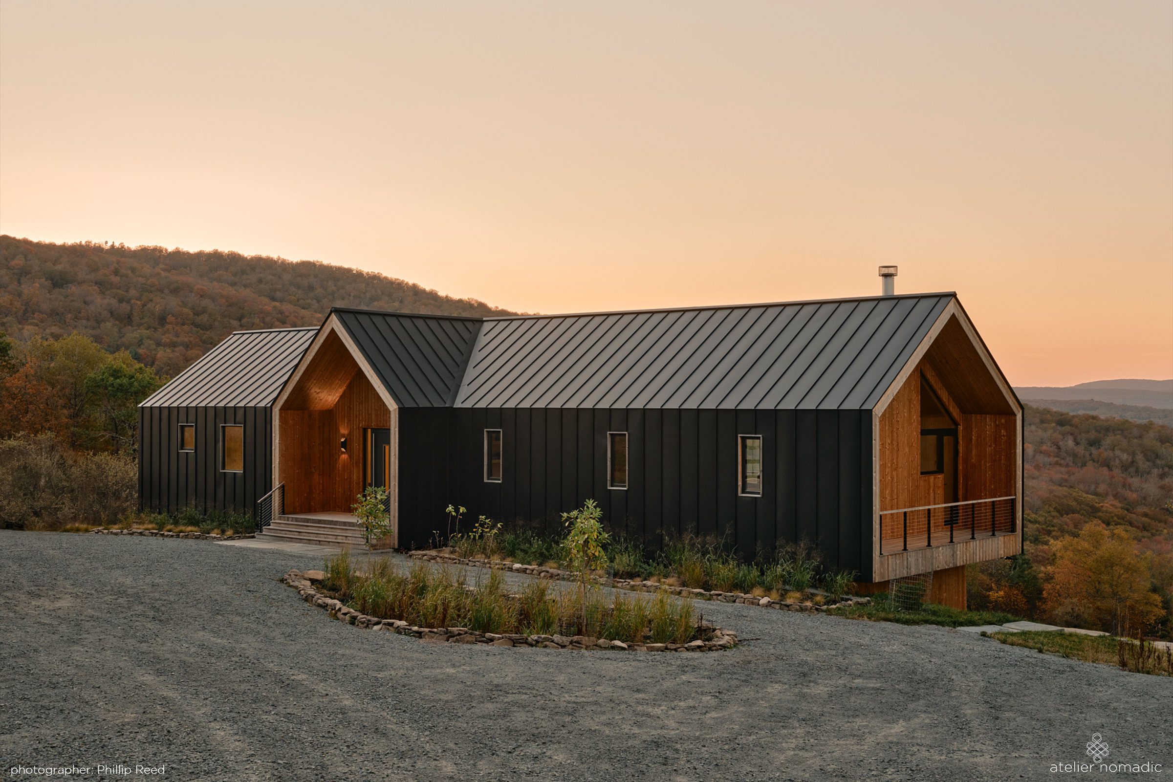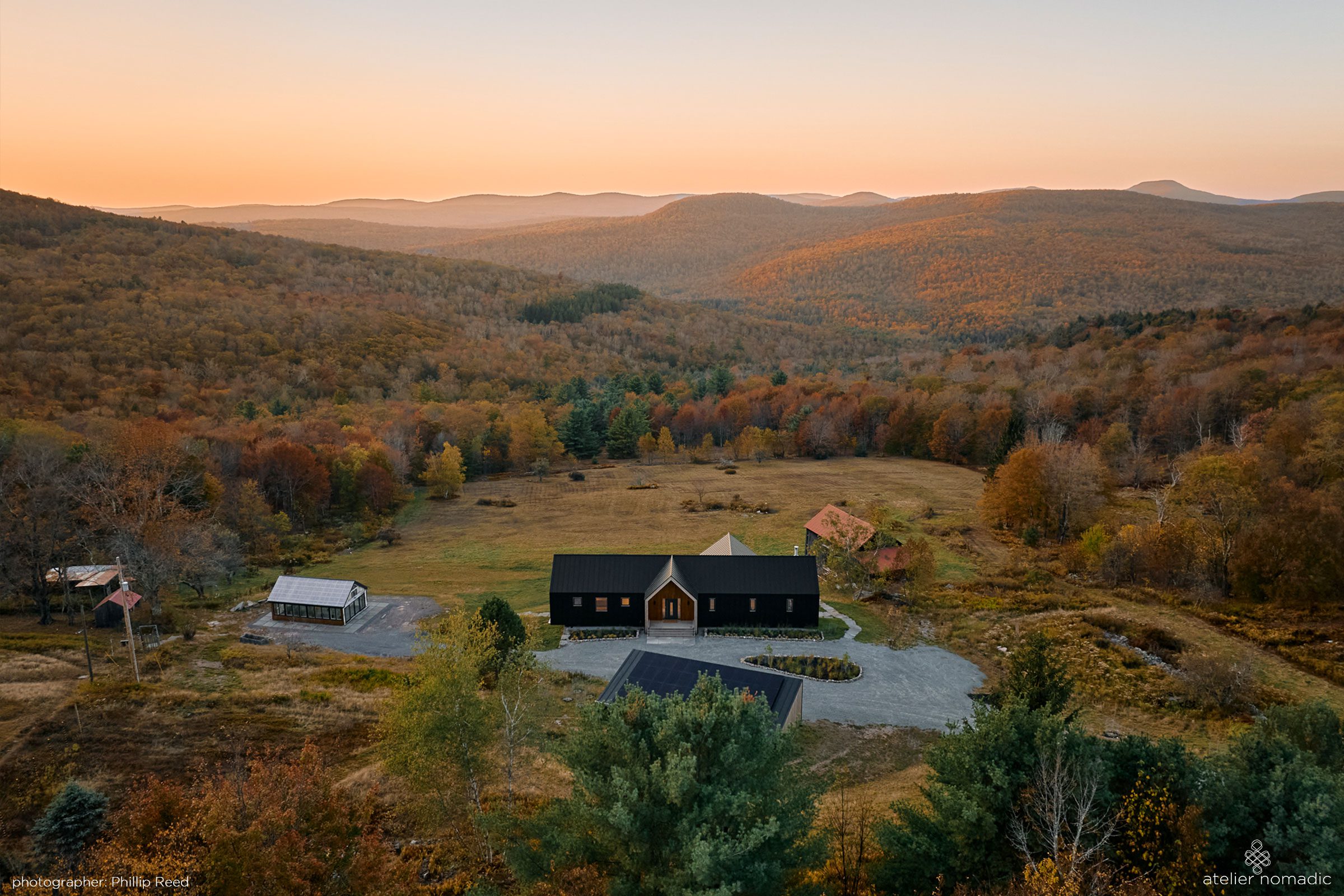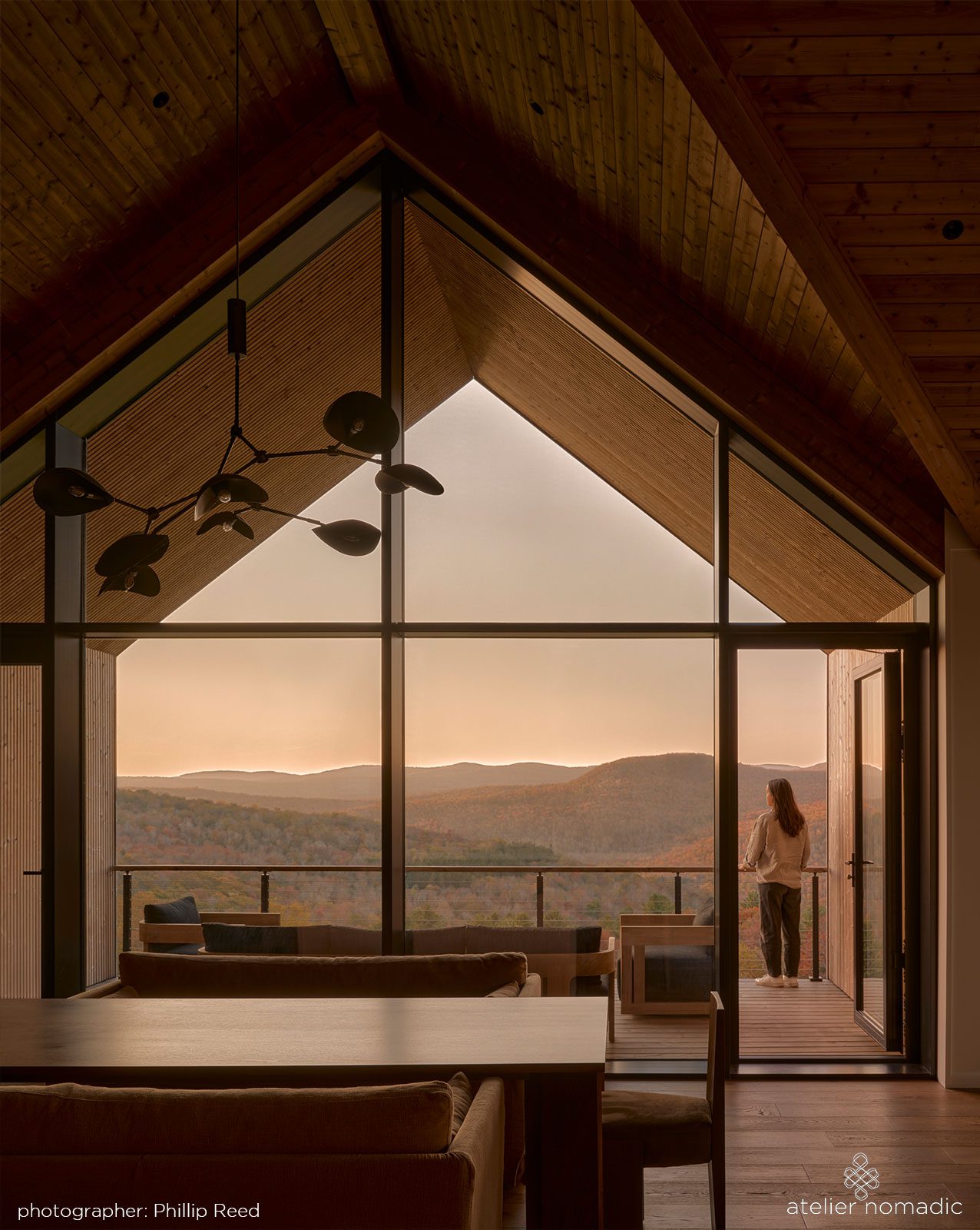 The four‑bedroom villa fuses contemporary sustainability with the vernacular spirit of the Catskills — echoing the region’s historic barns and the romantic landscapes immortalized by Hudson River School painters. At 3,630 square feet, the residence is carefully sited to embrace panoramic views of the northern hills, with cantilevered balconies framing sunrise, sunset, and the drama of the changing seasons.