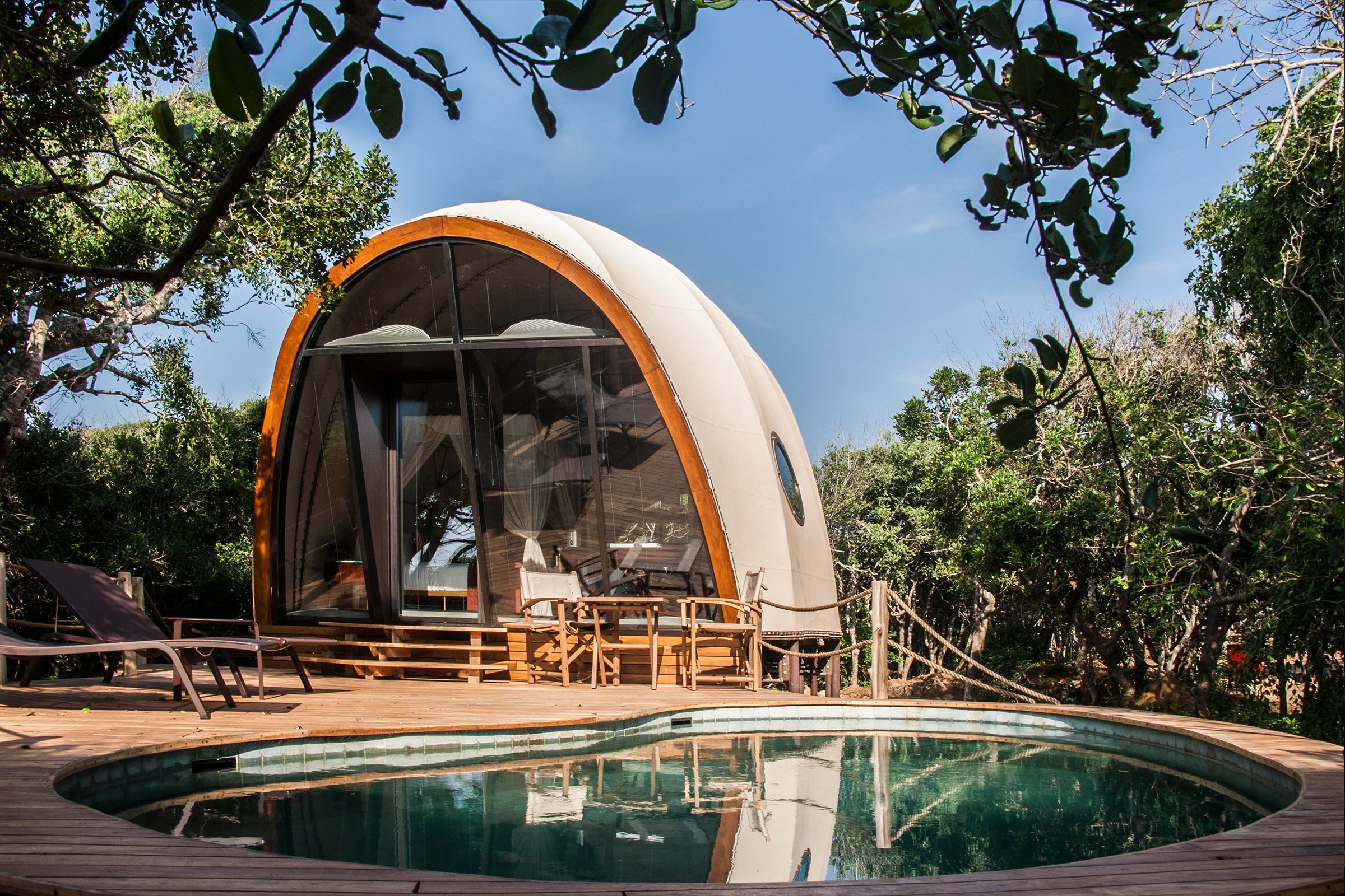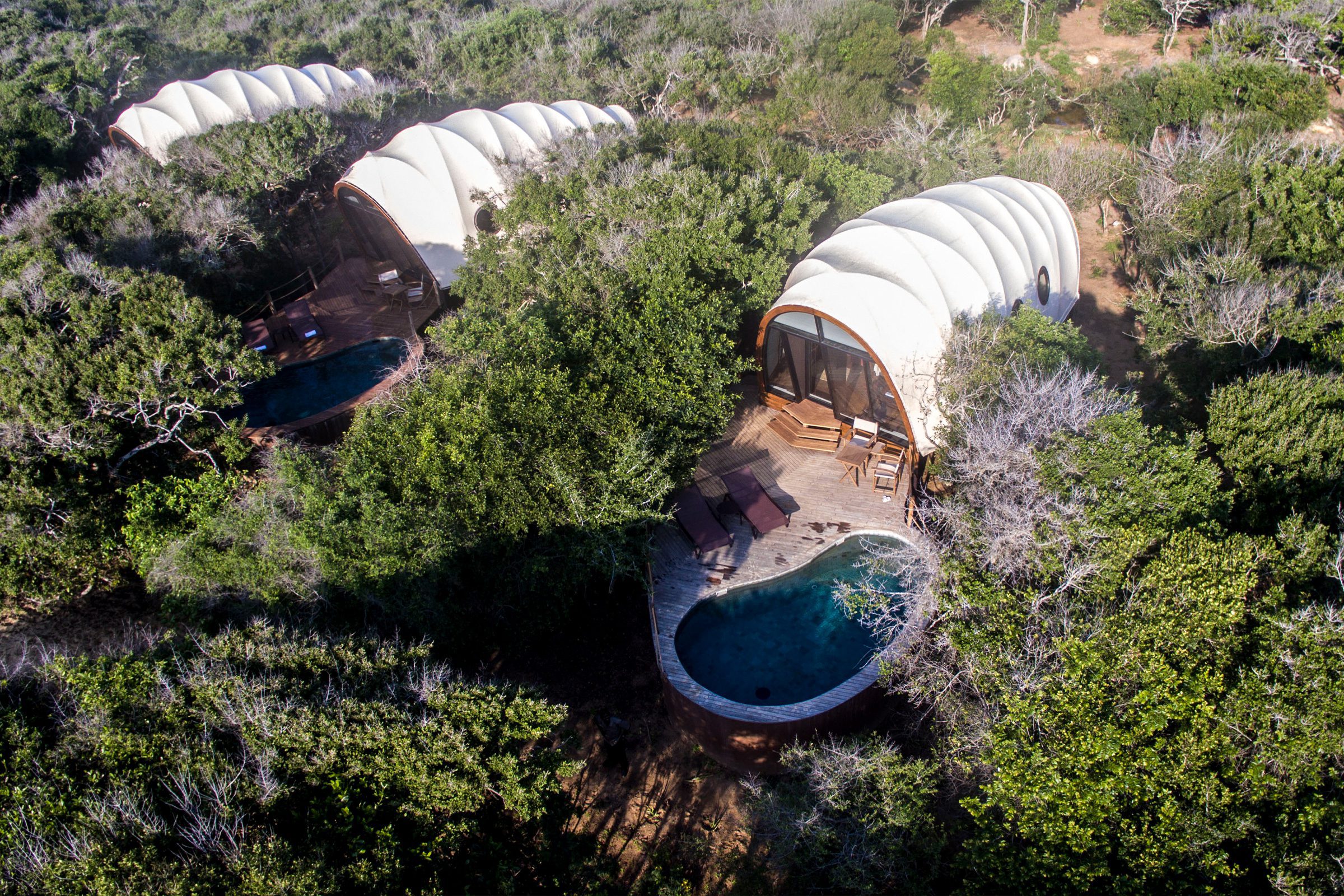 The Cocoon Suites function as the guest accommodation of Wild Coast Tented Lodge in Sri Lanka. The light-weight prefabricated tented pods are customized versions of Nomadic Resorts Looper model that are inspired by the form of a caterpillar. The 4.5m high vaulted ceiling provides a spacious interior while keeping a relatively compact and efficient layout. The units include a bedroom with living, a fully functioning en-suite bathroom and an outdoor living area with plunge pool.