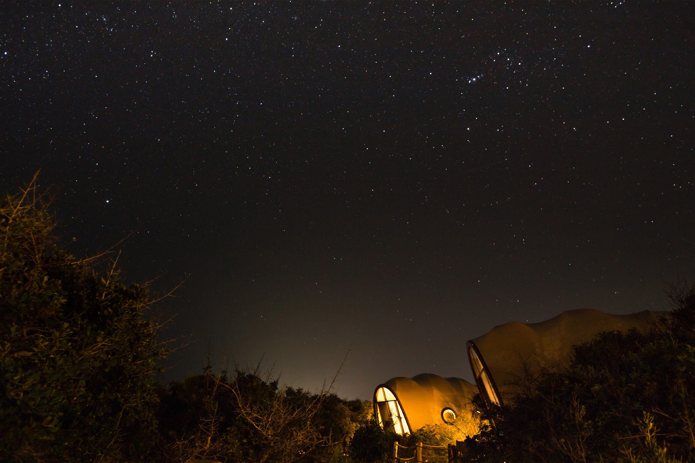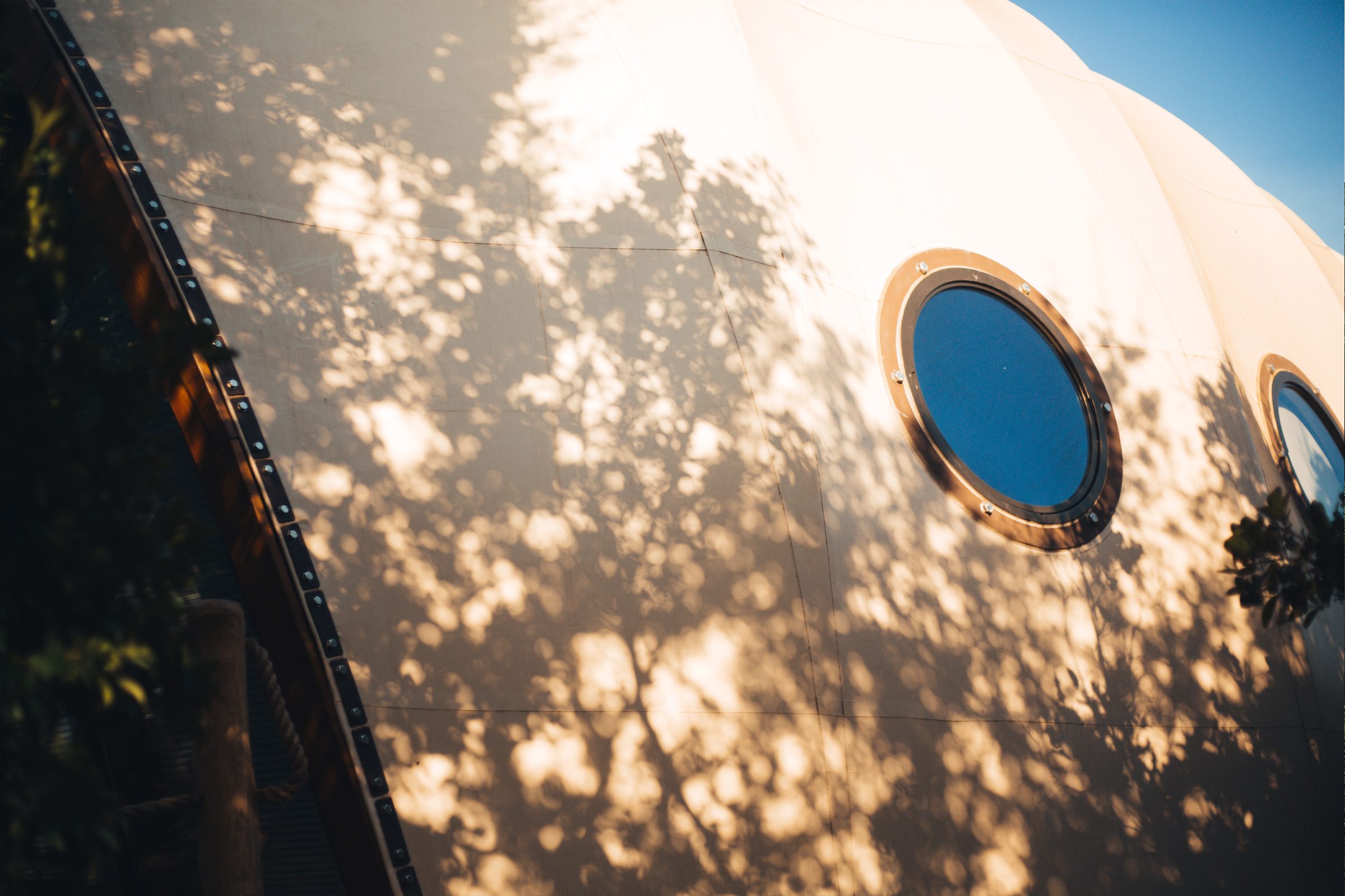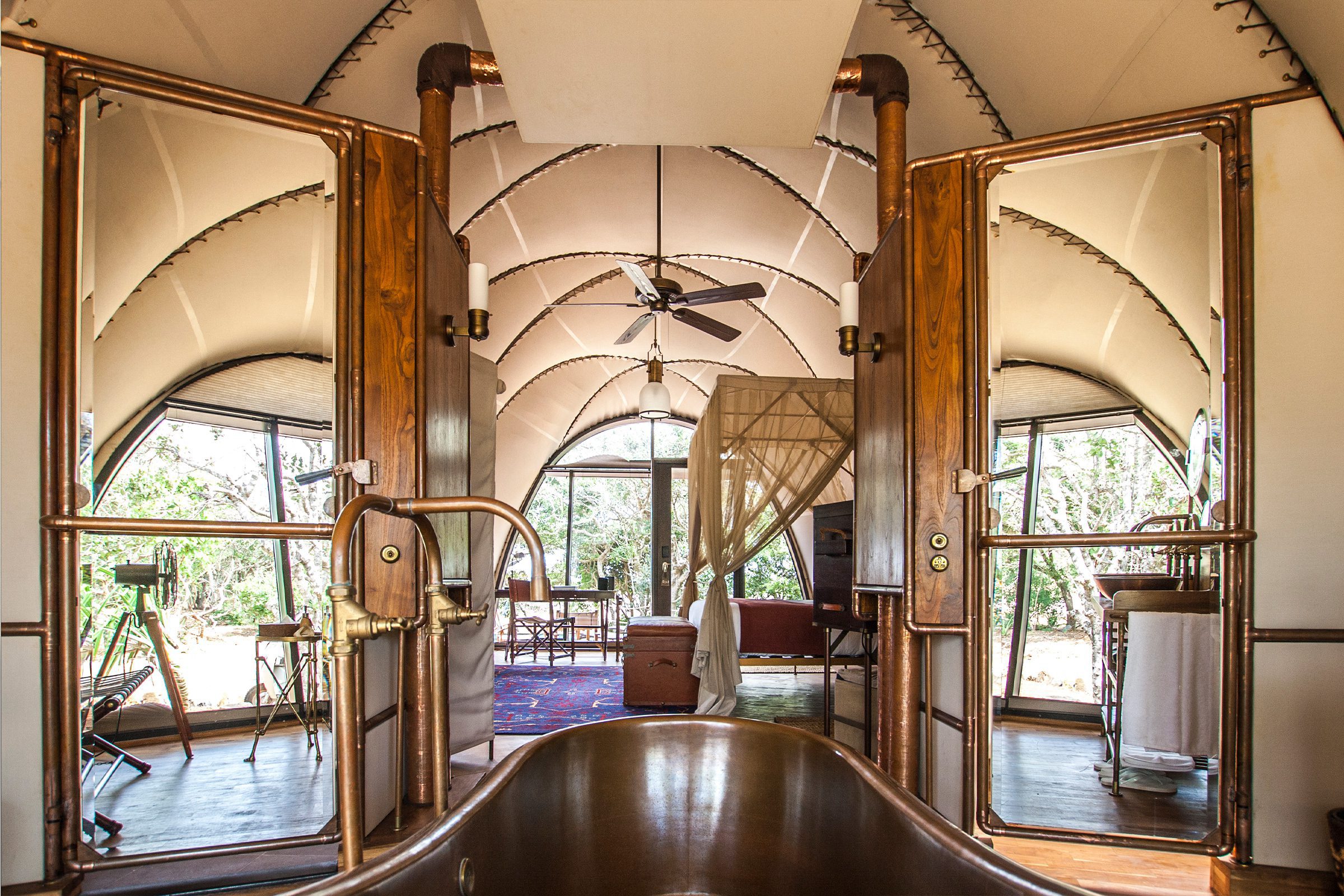 The interior concept has been developed by Bo Reudler Studio and combines ecological luxury and local elegance with a contemporary edge. It captures a sense of exploration and adventure associated with steampunk, airships and safari and campaign tents. The arched interior feels cocooning yet spacious, with all elements meticulously designed to accommodate the curvature of the fabric-lined walls. Central to the main space is a four-poster bed and bespoke campaign furniture that evokes bygone eras of discovery. In the open bathroom, guests bathing in the freestanding solid copper bath can enjoy private views of the bushland behind. Noble materials such as copper, brass, leather and plantation teak will age gracefully while local textiles add colourful accents.