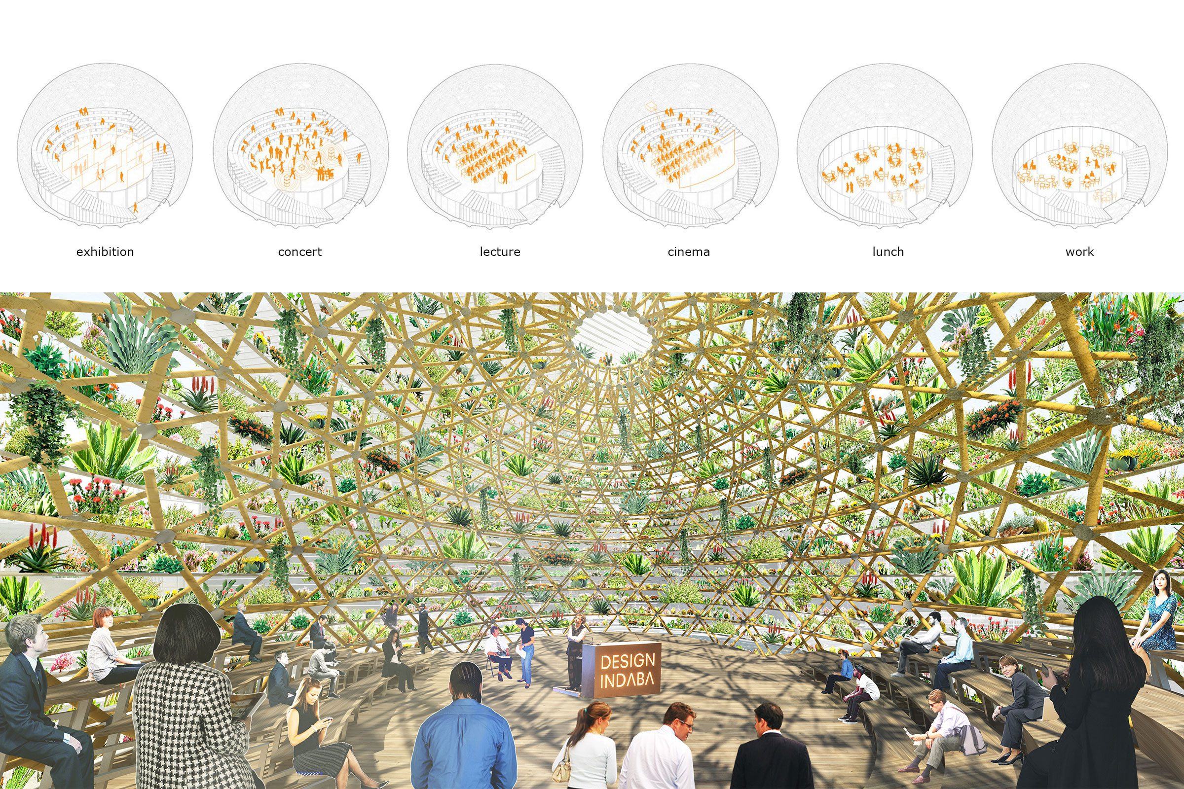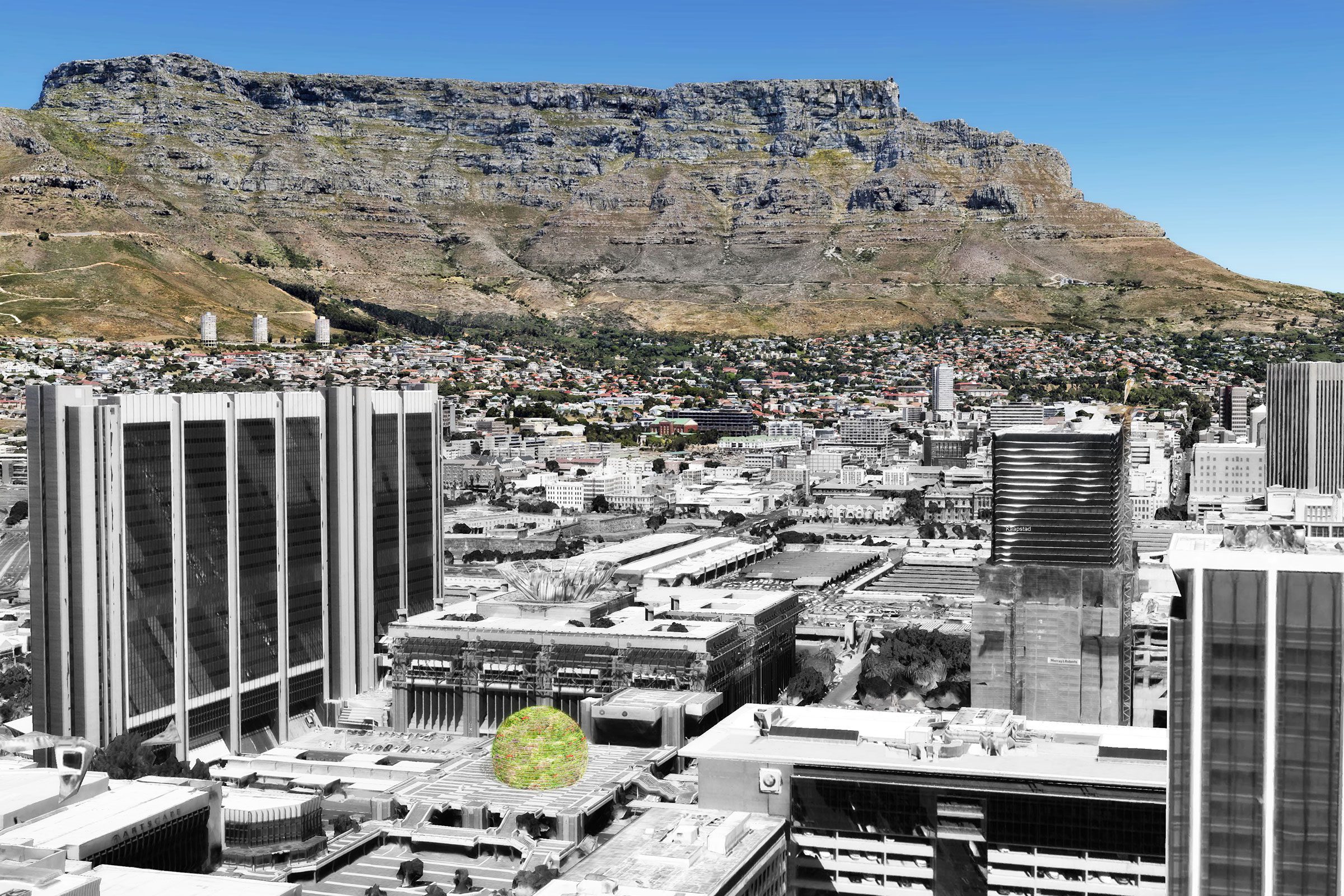 Centrally positioned on Luthuli Plaza in Cape Town, a green dome of 20m width and 15m height will offer an inviting garden-like space for urban encounters. The dome is an open shell covered with plants, forming a sphere-shaped botanical garden, hosting Cape Towns most exquisite local vegetation as well as air purifying plants. Underneath this vegetated shelter there is 175 m2 of indoor space and 175 m2 of stage and podium. Together they offer space for discussions, events, workshops, exhibitions, meetings, lunch and a quick coffee outside the big institutions, accessible for everyone. It is an attractive third place, and can become a hotspot in the cultural life of Cape Town.