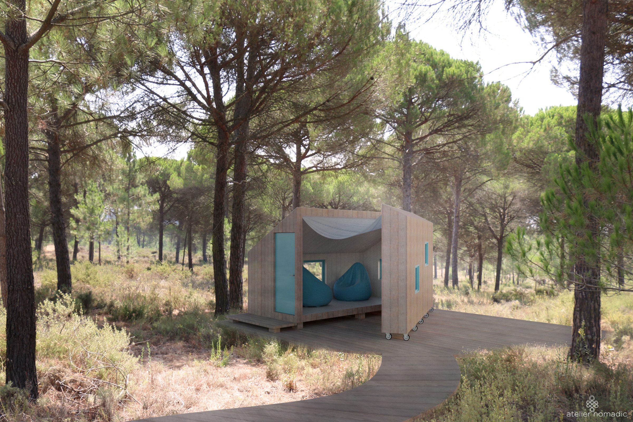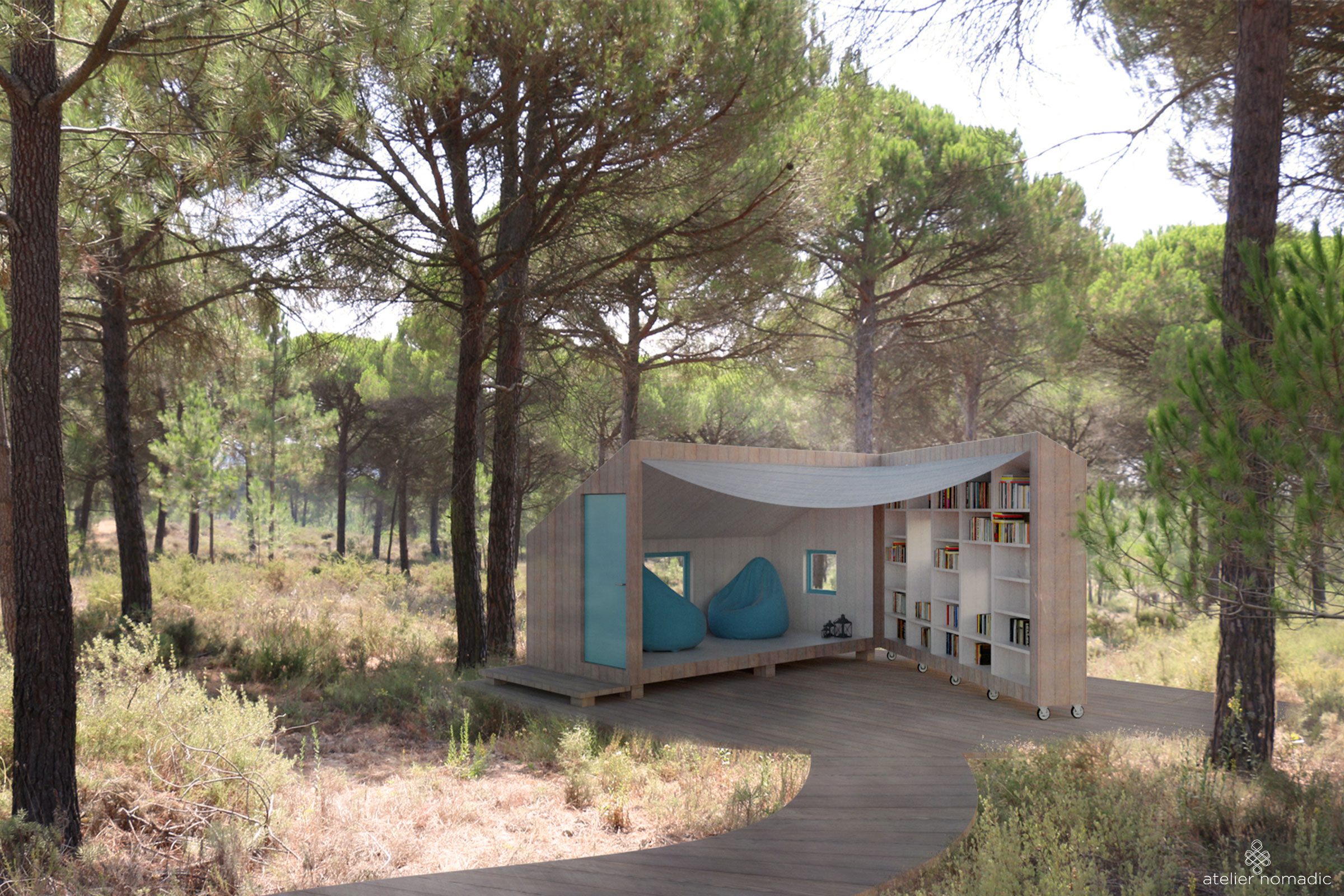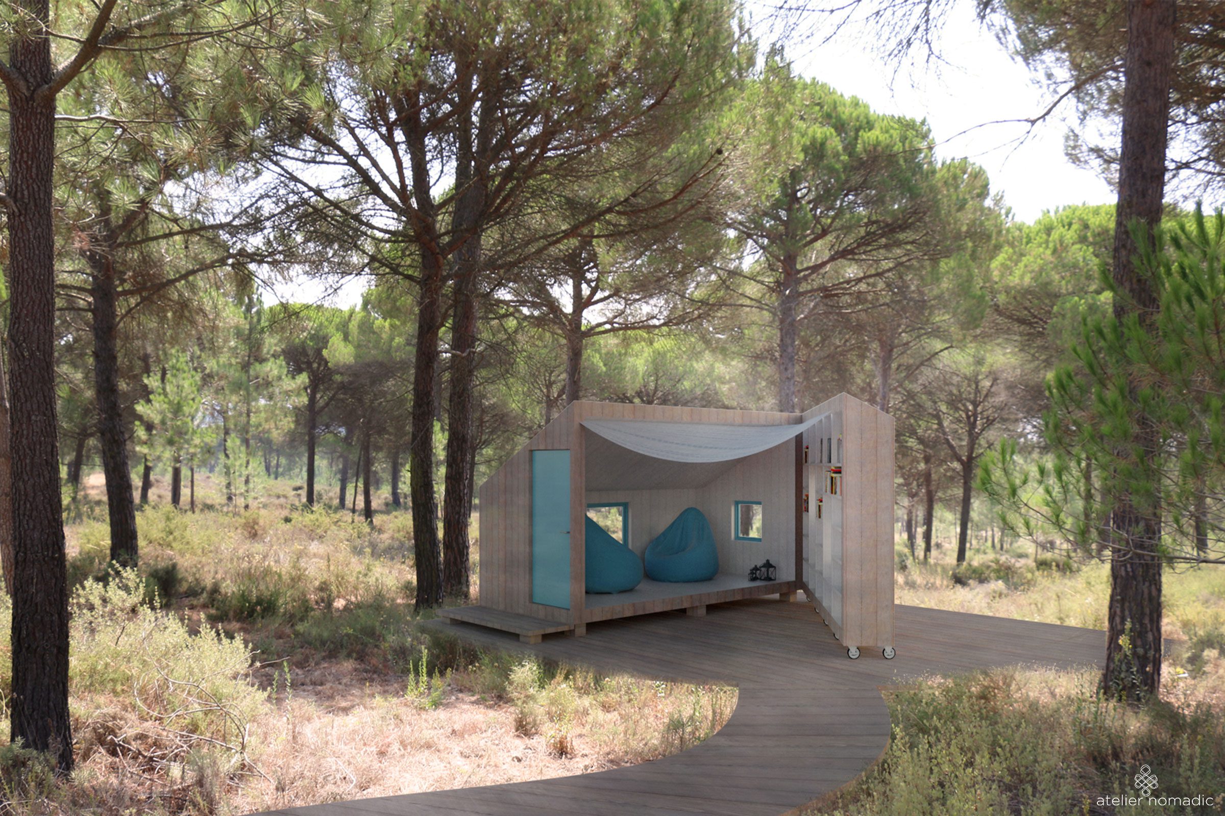 The private forest pavilions are developed as additions to a summer house located in the area of Comporta in Portugal. They will function as spaces for reading, relaxation and meditation.