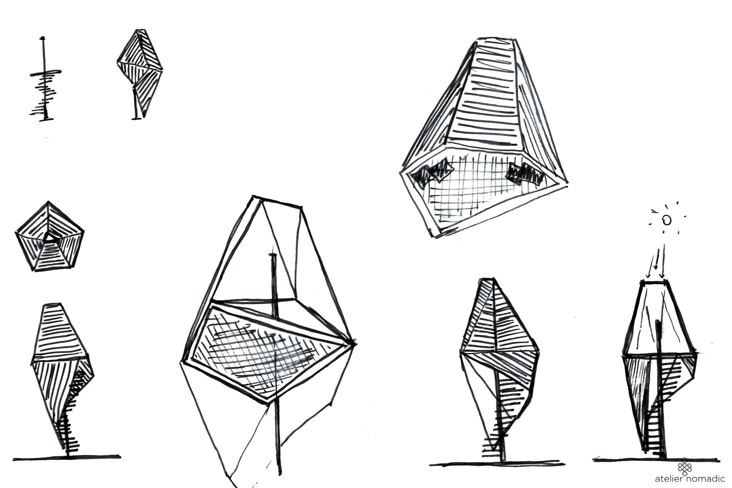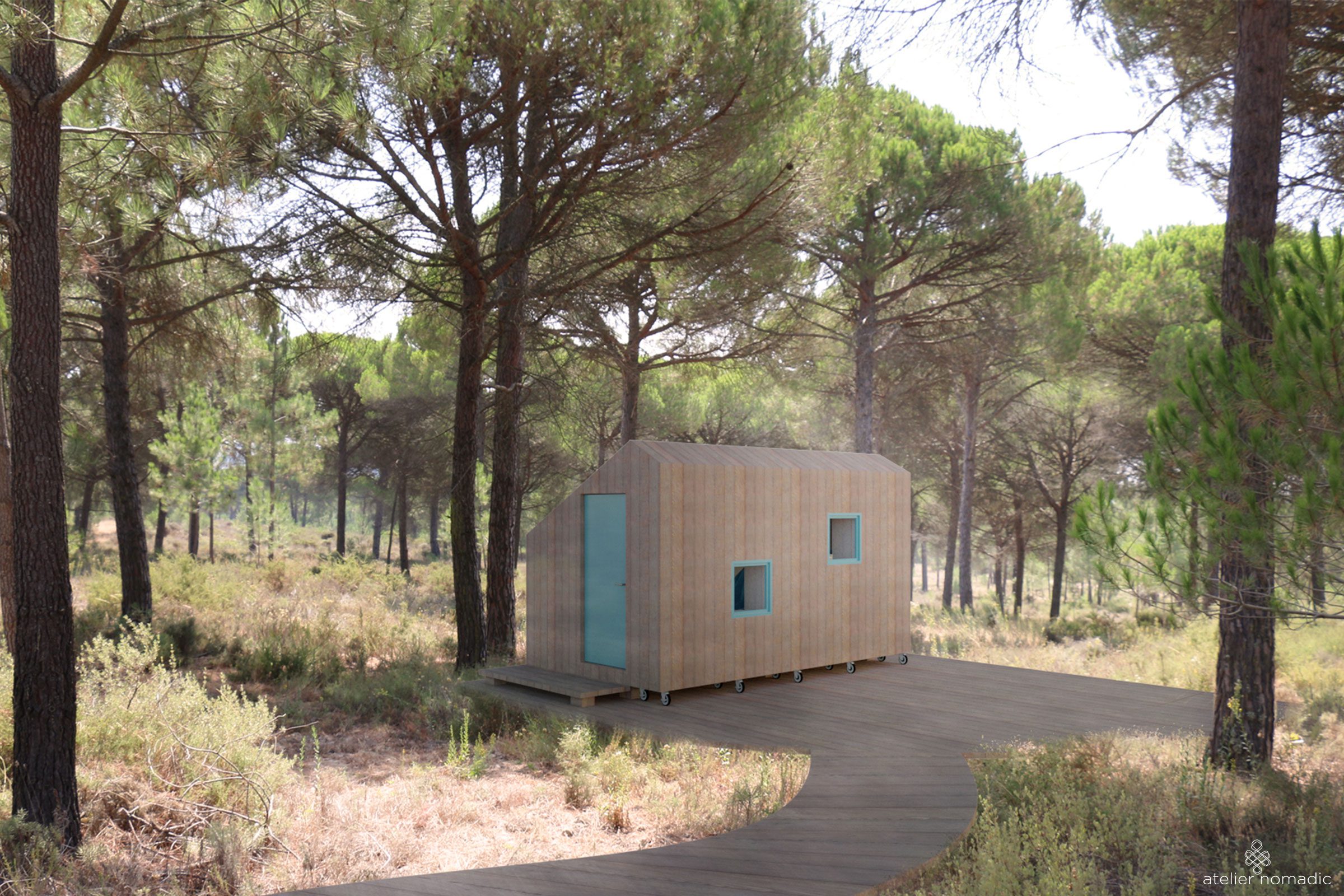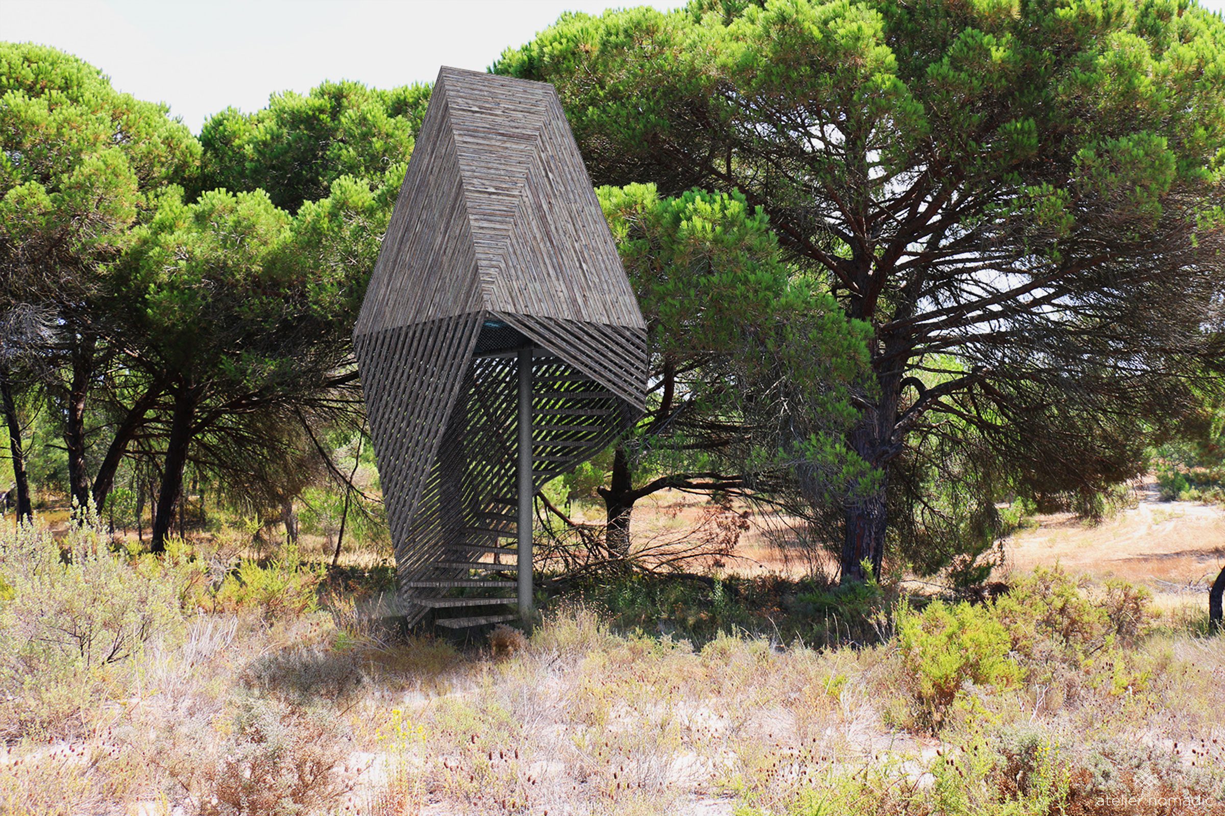 The private forest pavilions are developed as additions to a summer house located in the area of Comporta in Portugal. They will function as spaces for reading, relaxation and meditation.