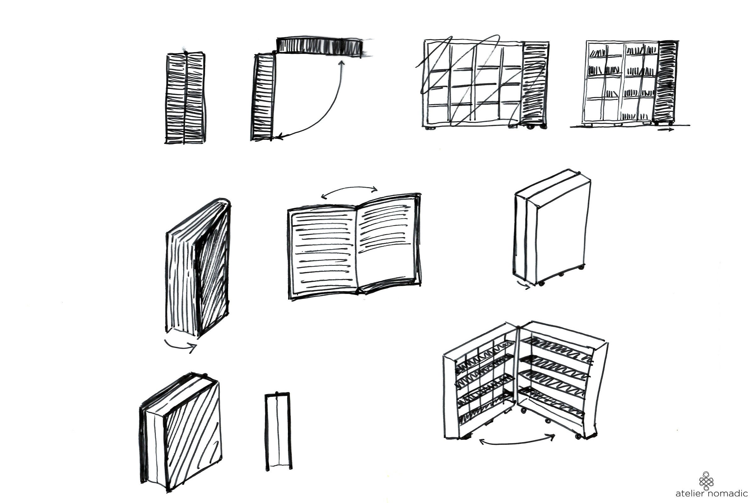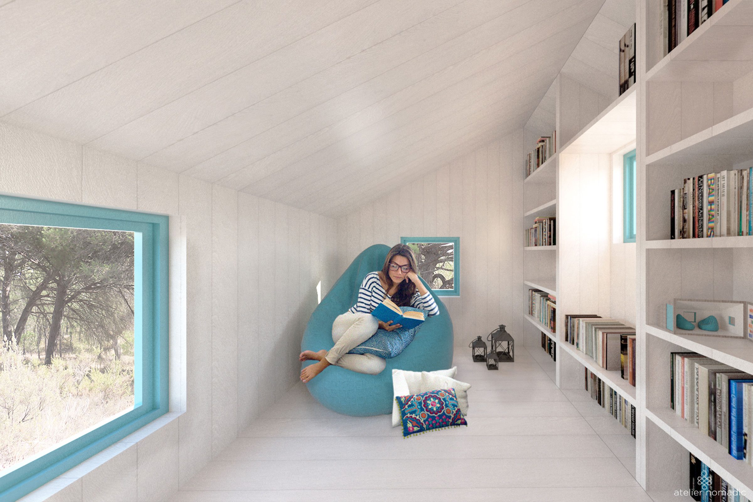 The library can be used in different ways in response to the clients needs and weather conditions. During the clients absence and the colder months it can stay as a compact reading space, while during the warmer months it can be opened up to the surrounding forest like a book, blurring the lines between inside and outside.