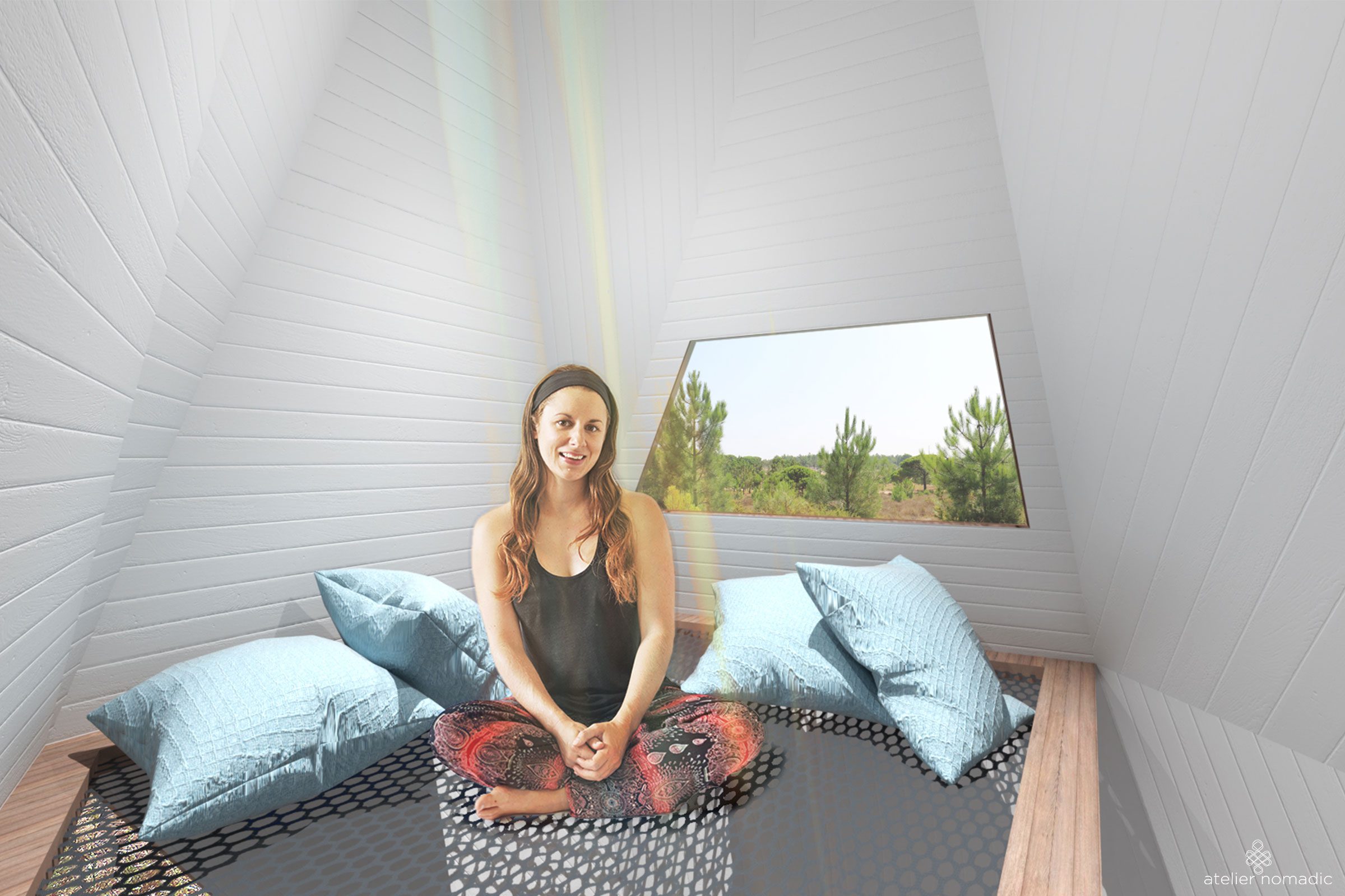 The treehouse is an abstract interpretation of a seashell and offers a relaxation space to retract and relax with a view over the forest valley. The catamaran netting floor and open skylight allow for natural ventilation.