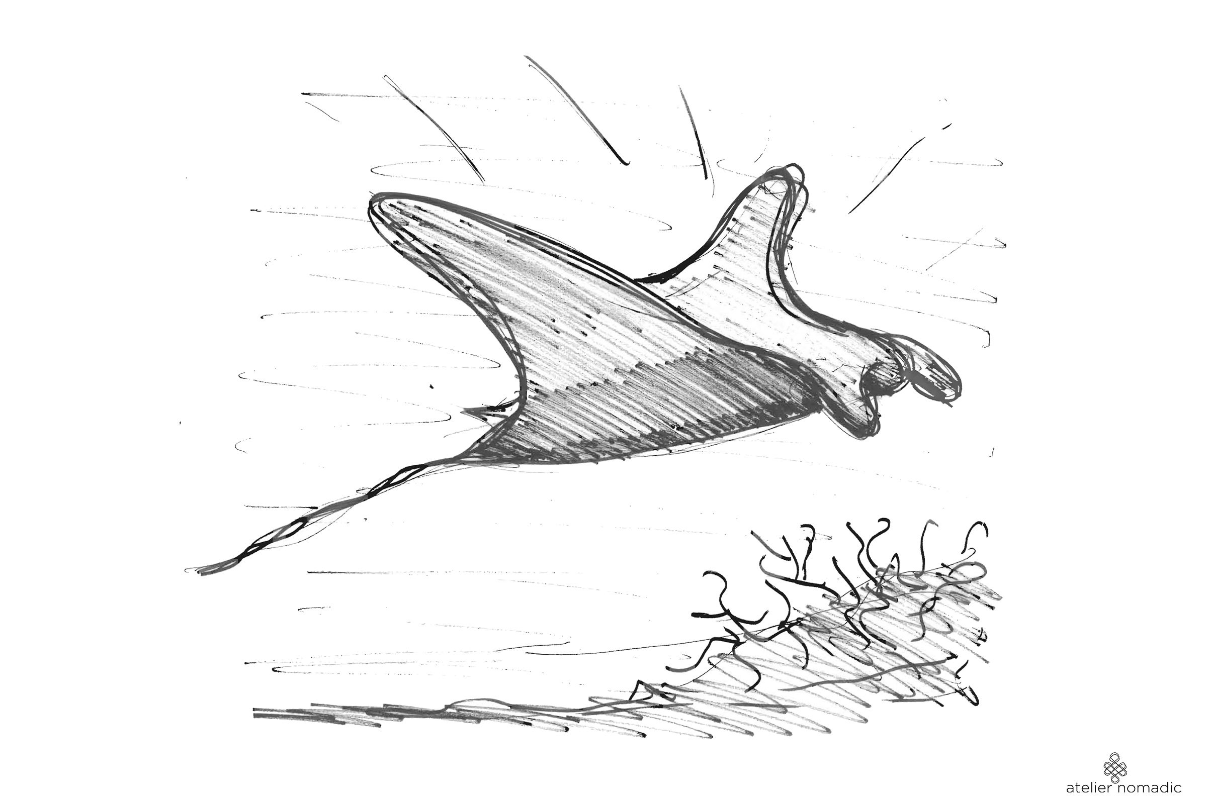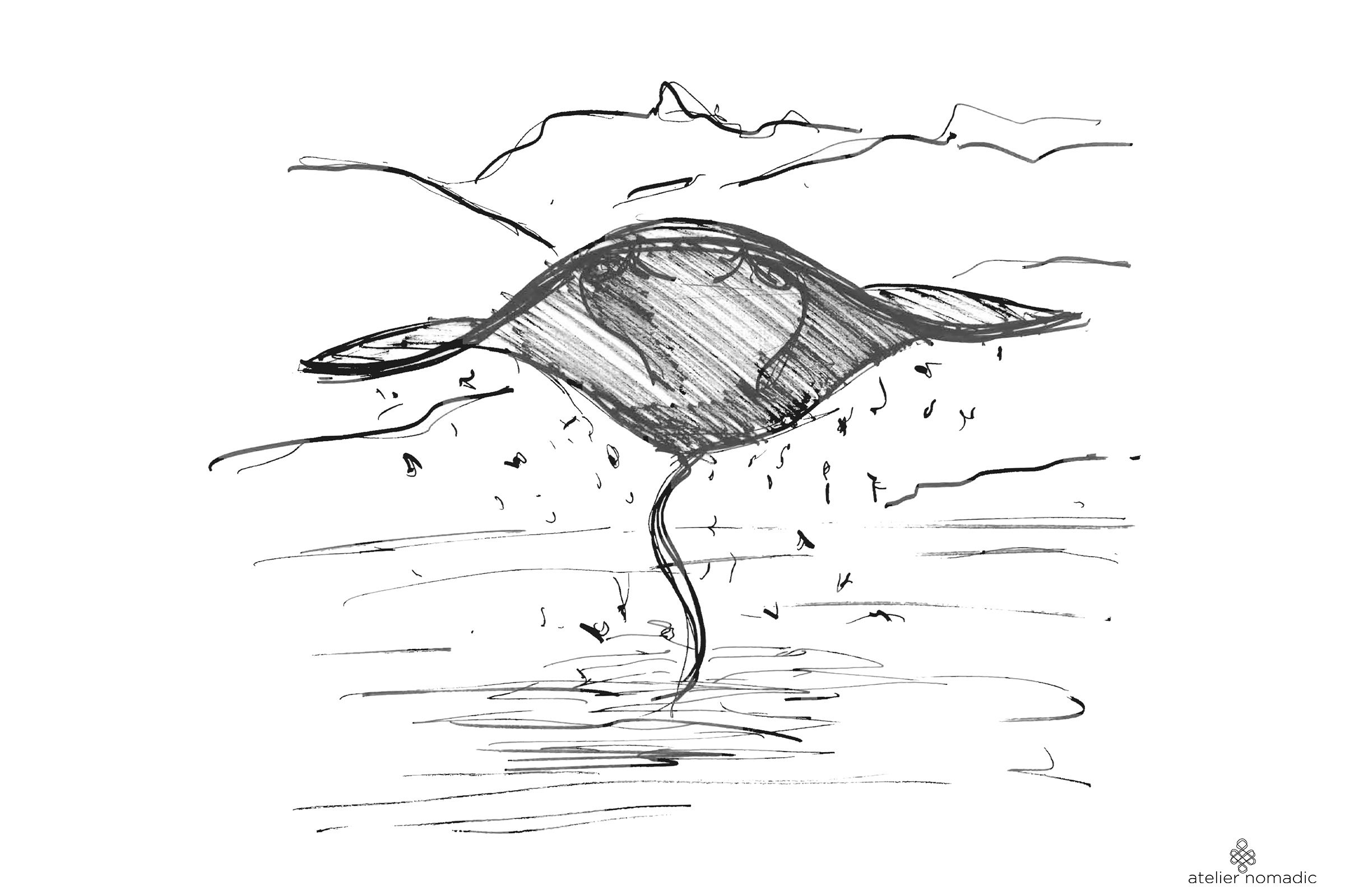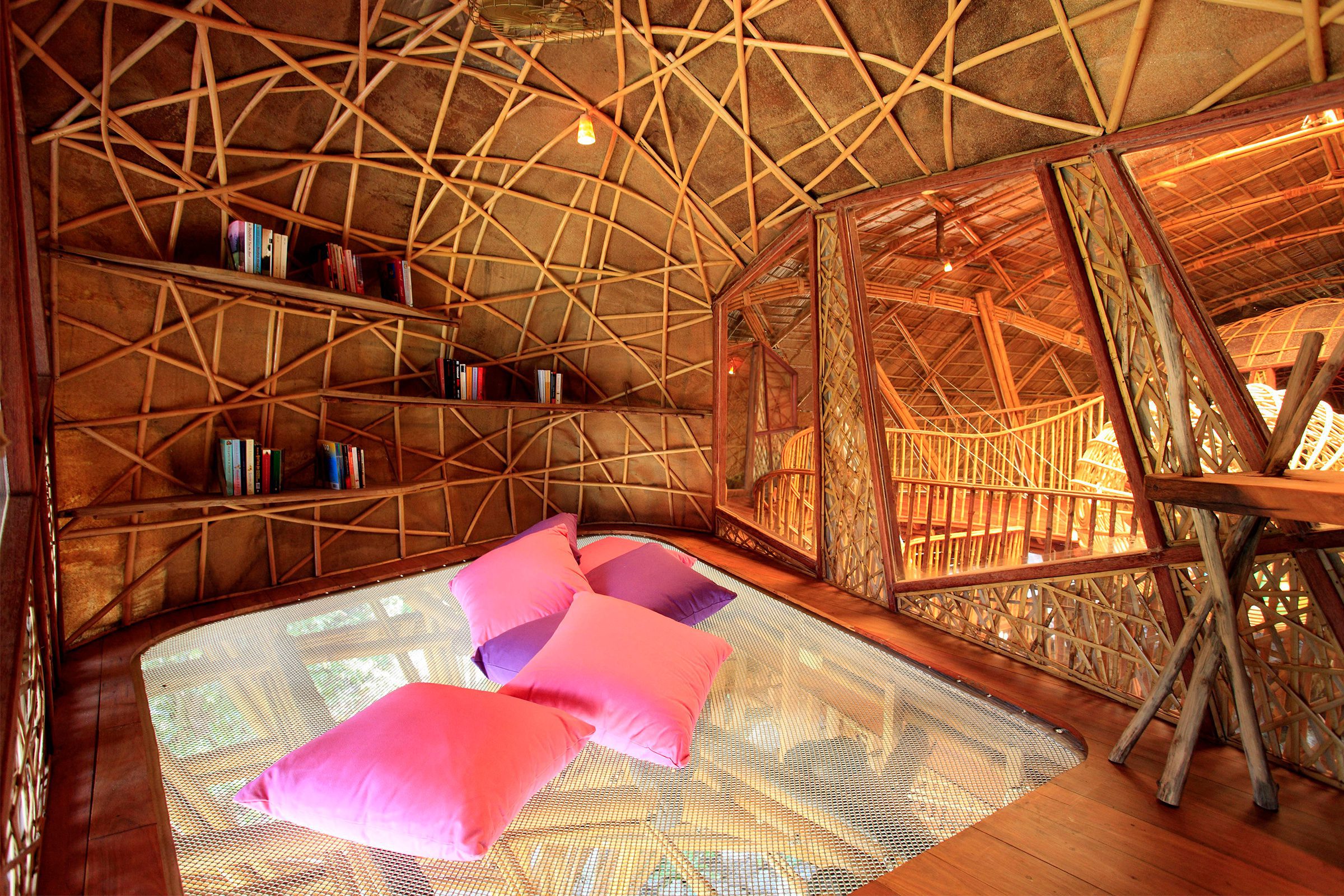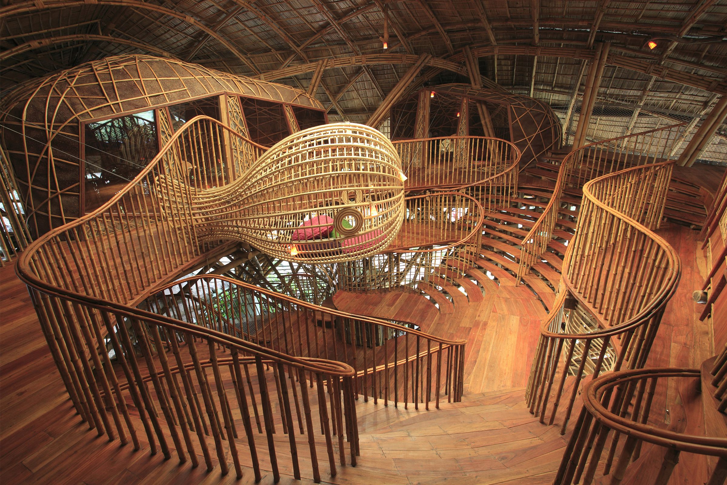 The Kids Den is located at a rocky slope overlooking the bay. With its Manta-ray inspired bamboo dome, perched in an elevated position so as to offer magnificent views, it seems to launch itself into the bay. The structure and roof are made from local Thai bamboo, thus contributing further to the ecological approach of the resort. The interior is made from local plantation River Red Gum wood and rattan structural elements for the inner domes.