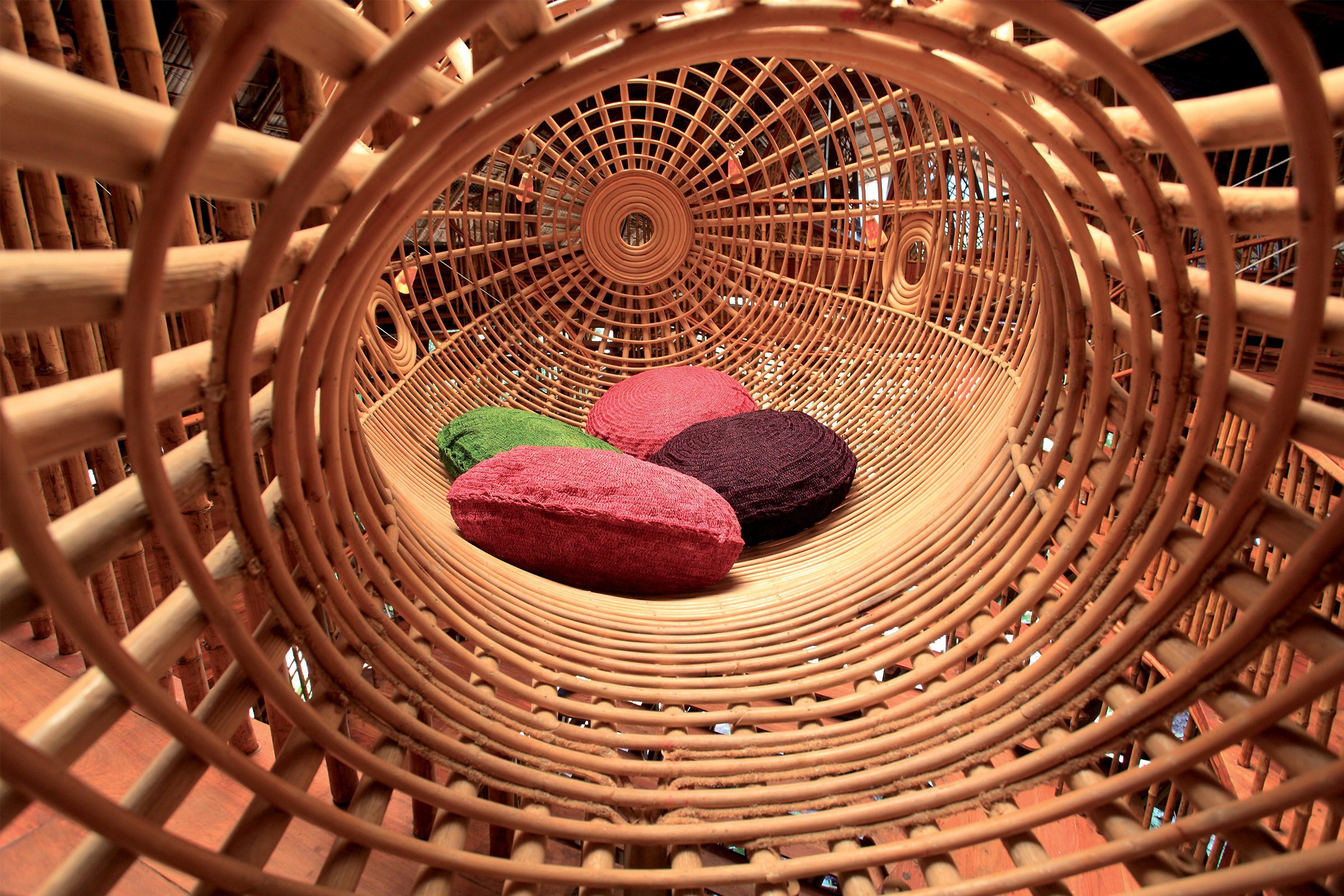 The structure uses a mix of modern and traditional joining techniques. Due to the heavy loads in the 12m high and 28m wide structure, bolted joints were used for the main structure. At these joints, the bamboo has been filled with a cement injection to prevent the bamboo from splitting.