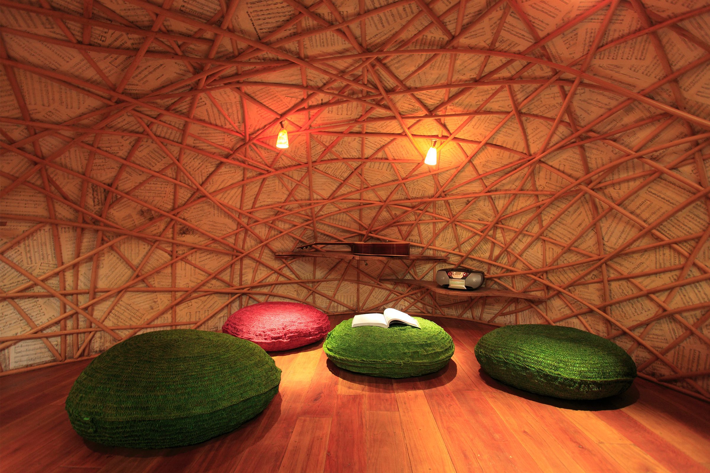 For the secondary roof- and belly-structure, bamboo dowels were mainly used in combination with rattan which was winded around the bamboo bundles. The roof consists of a ceiling of split bamboo with a waterproof membrane on top, covered with bamboo shingles.