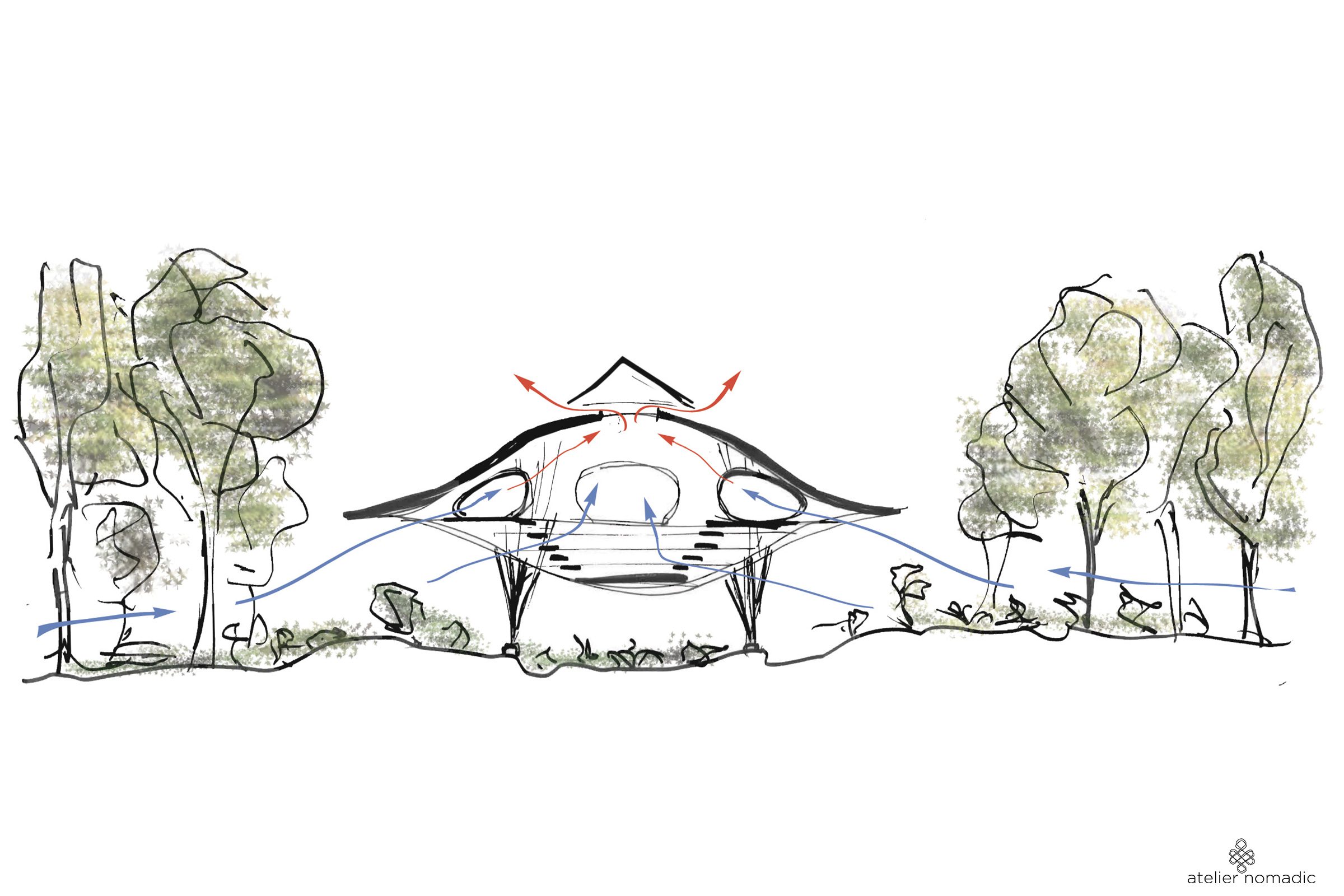 The building has been elevated from the forest floor, allowing fresh air to enter through the gaps between the theater steps. Walls are disconnected from the roof to stimulate the internal airflow. The top of the roof is lifted allowing hot air to escape.