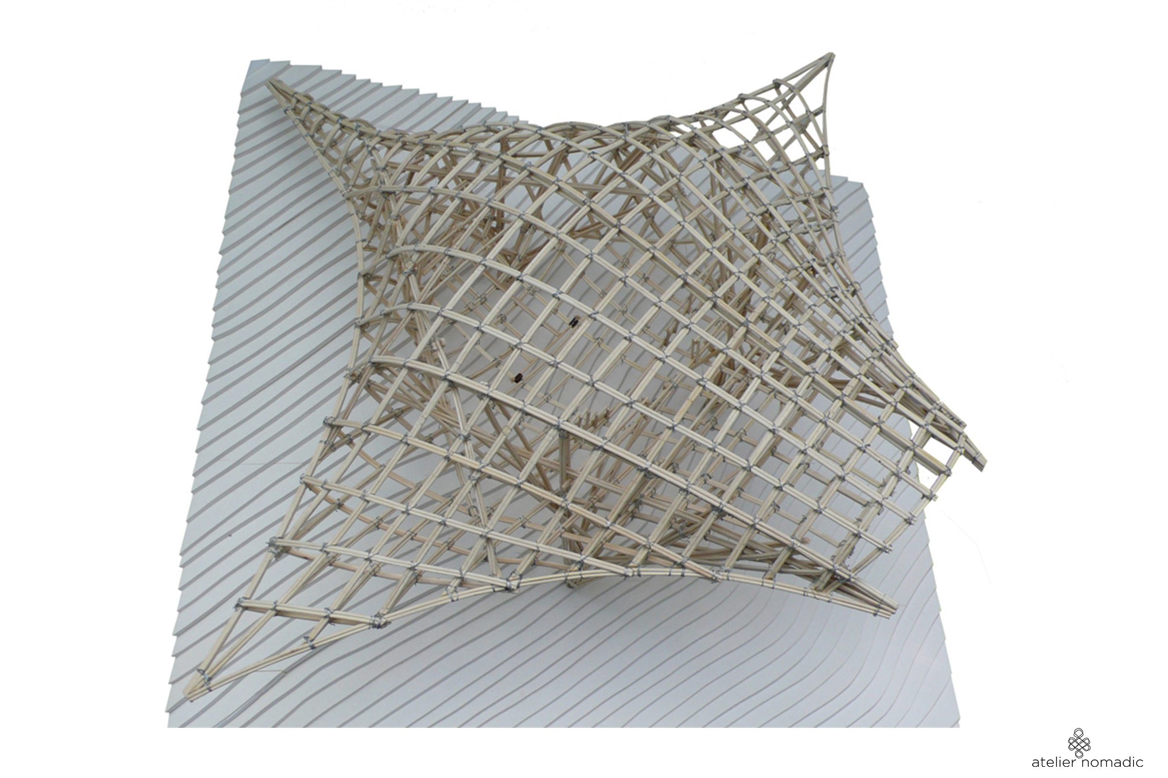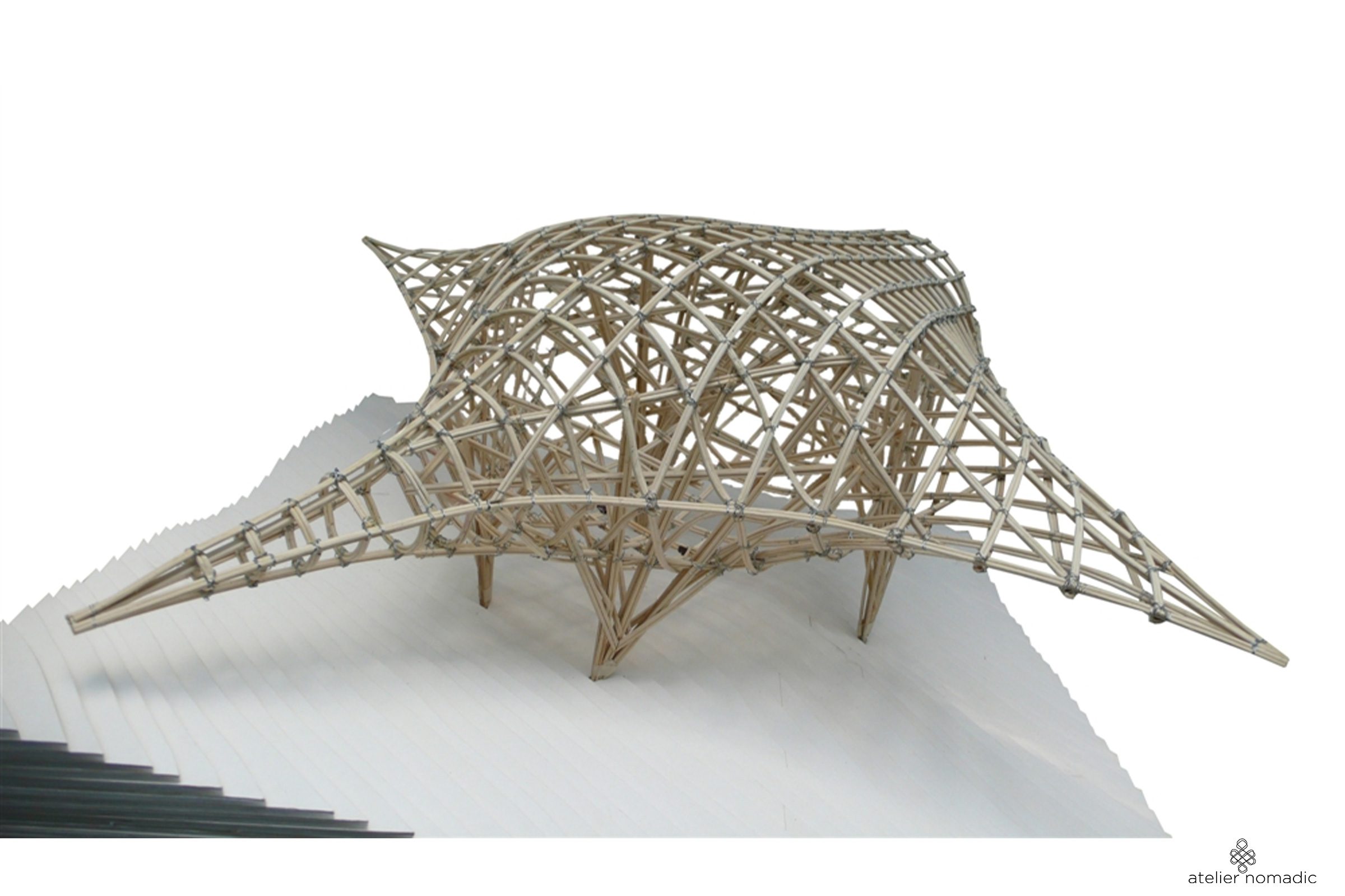 All beams have been generated from a 3D computer model. For making the curved beams, the individual bamboos have been heated 1 hour in a specially developed steam oven, after which they were assembled in an adjustable formwork with a coordinate system, forming each of the more than 70 individually curved beams.
