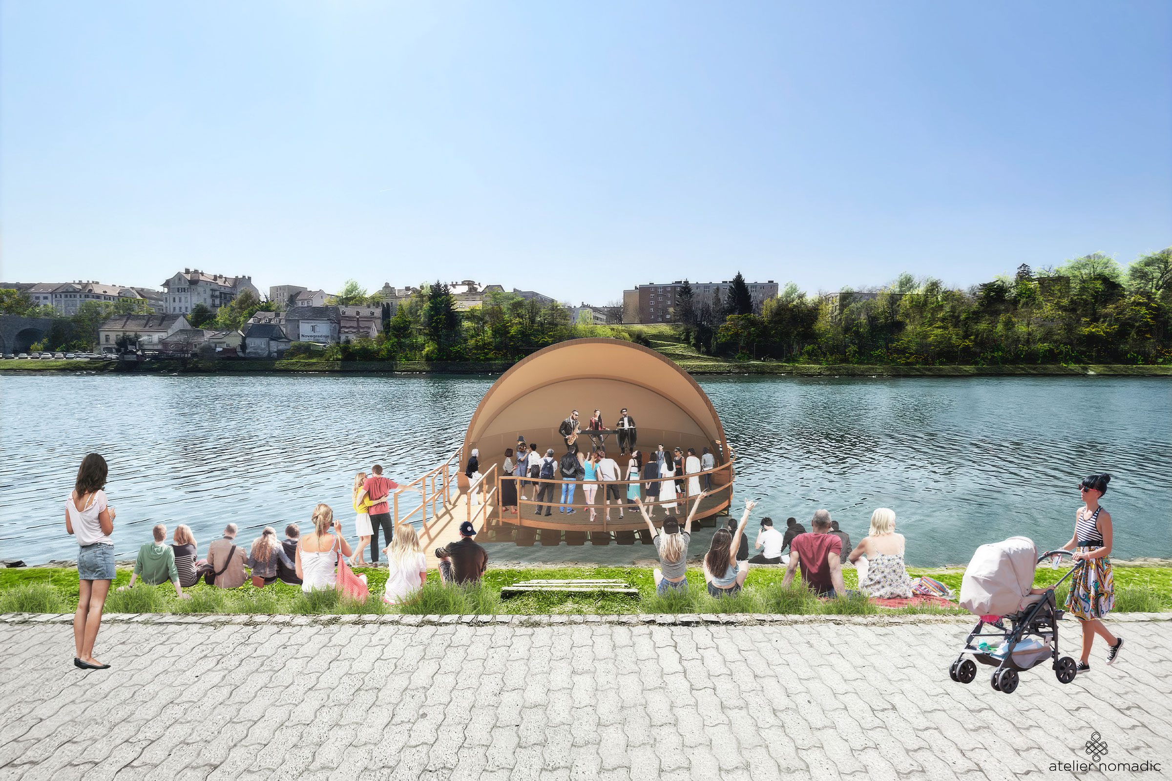 The river pavilion will activate the banks of the Drava River in the city of Maribor. It will host cultural events such as music performances, lectures, wine tasting events or dance acts as a place for contemplation and relaxation by the river.