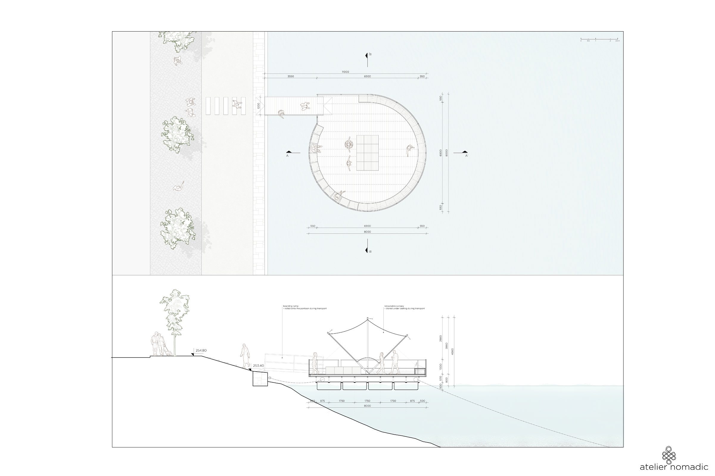 The roof can be folded down and stowed inside the semi-circular bench for open-air events or during transportation to other locations along the river, allowing for a safe passage under the bridges. The boarding ramp (or bridge) can be rolled onto the main platform during transportation.