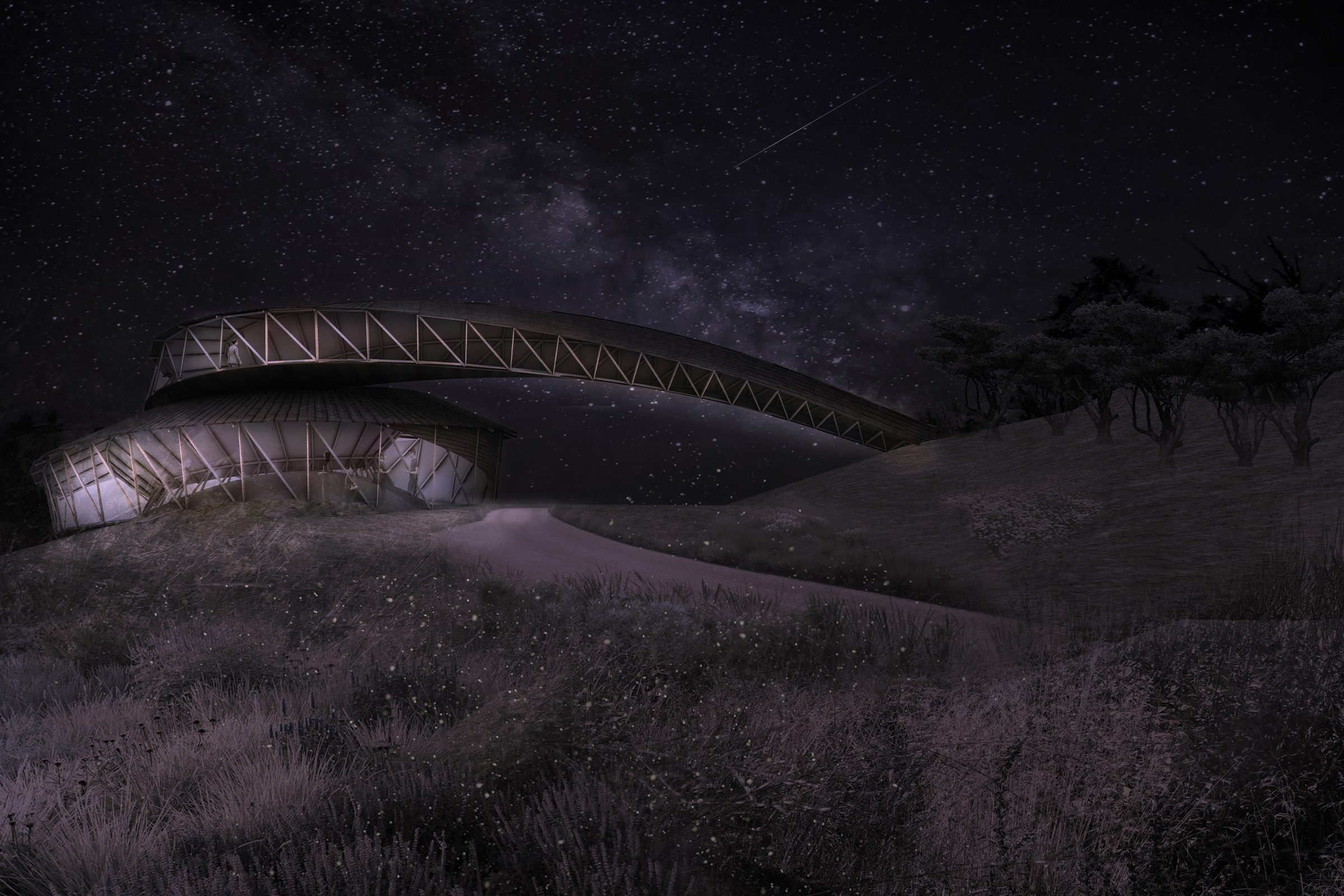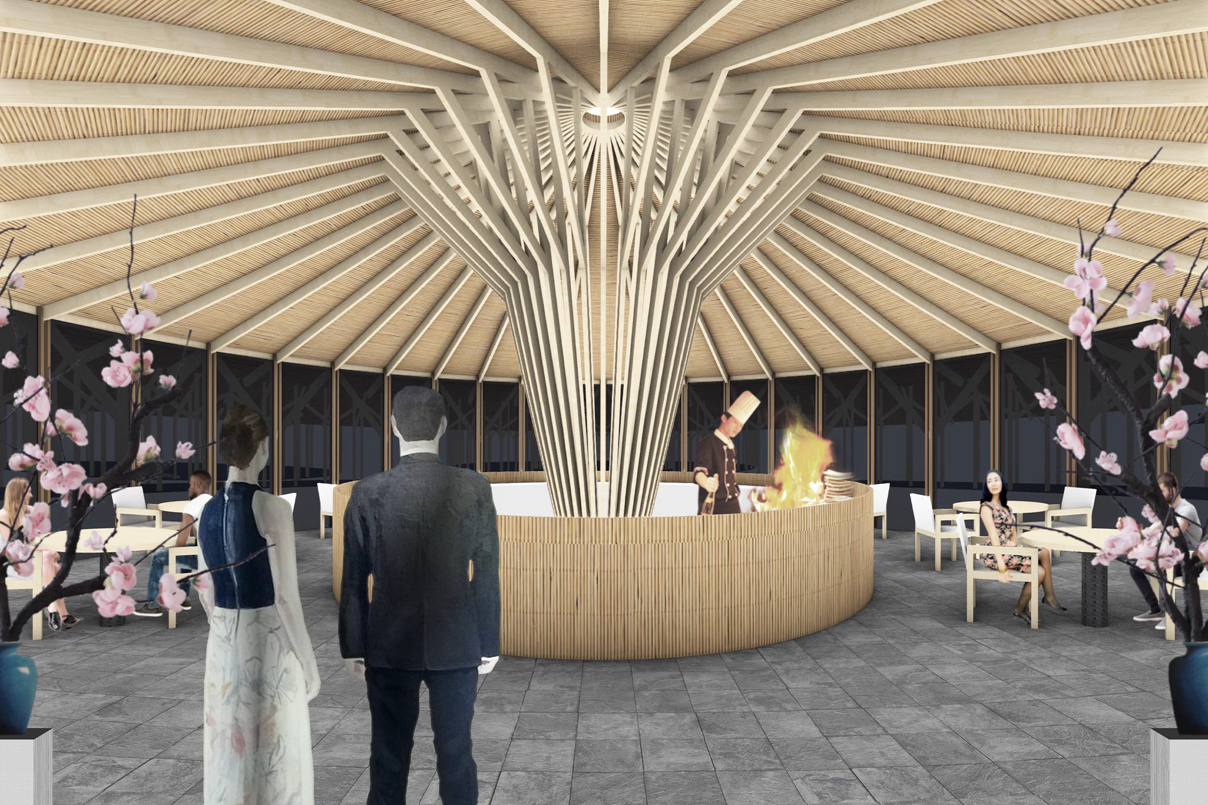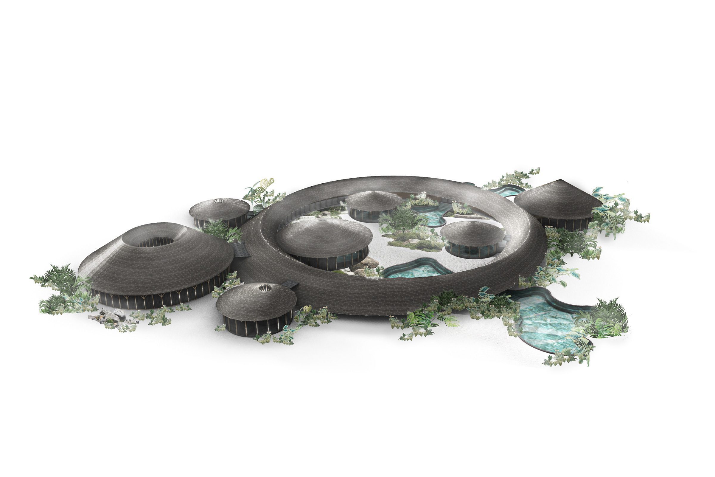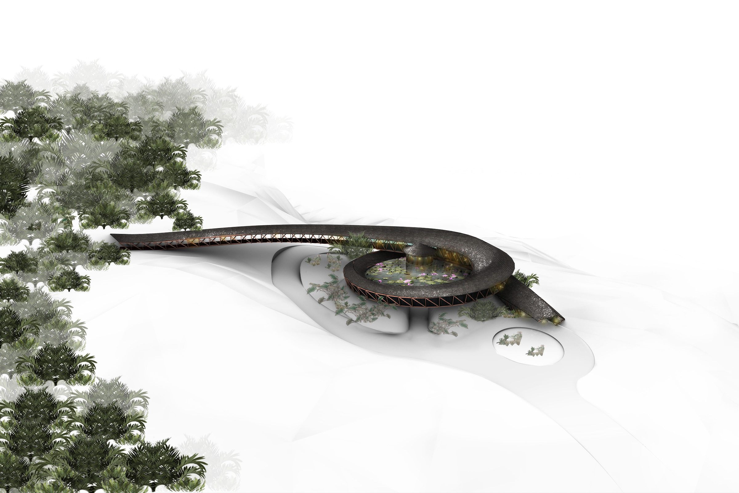 The concept for this project investigates the various forms that water can take like a stream, a vortex or as concentric ripples produced on water’s surface when an object is dropped into it. Each of these rings offers different opportunities for private groups and individuals. The serene teahouse is located in the centre of a placid lake offering guests an opportunity for meditation and contemplation.
