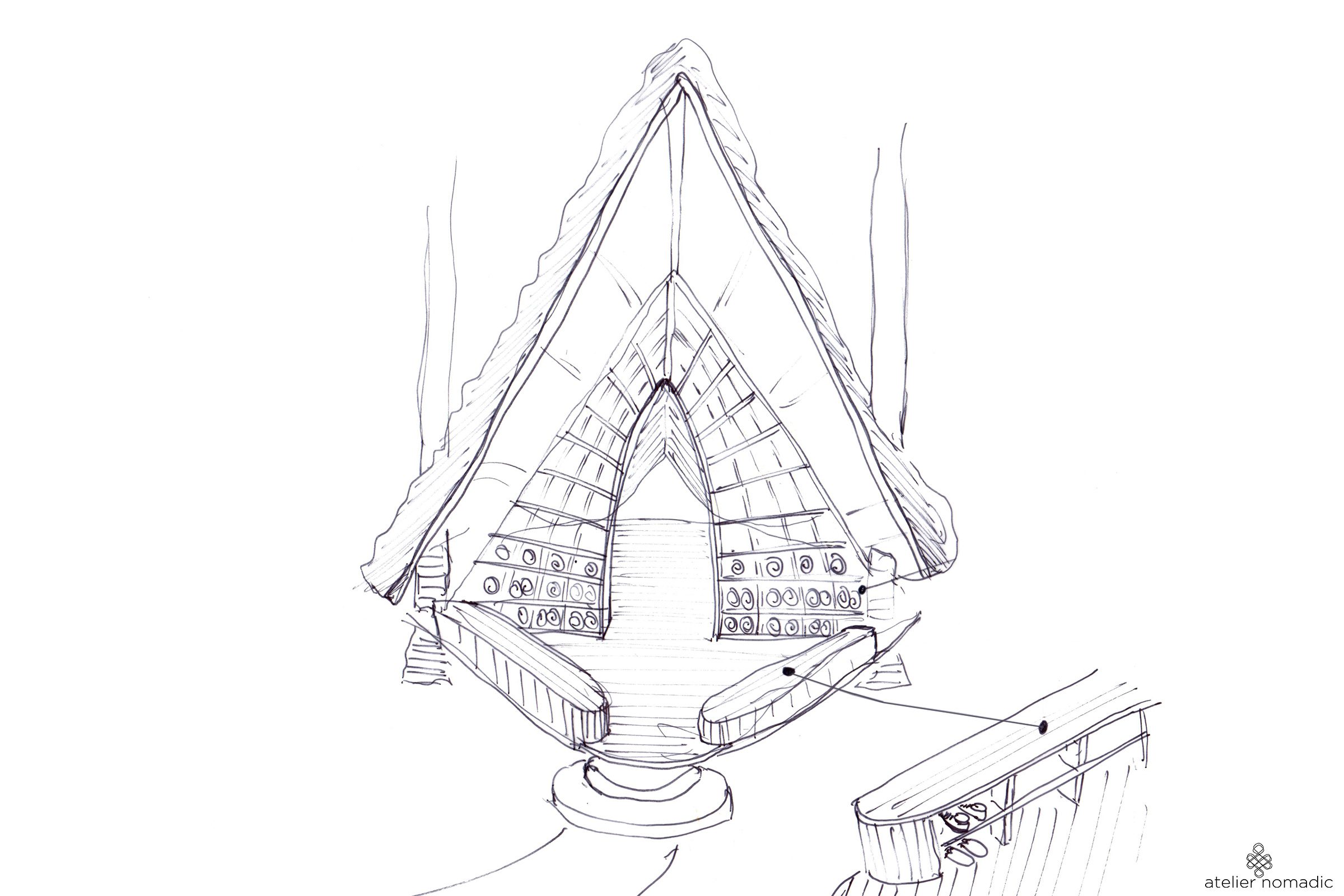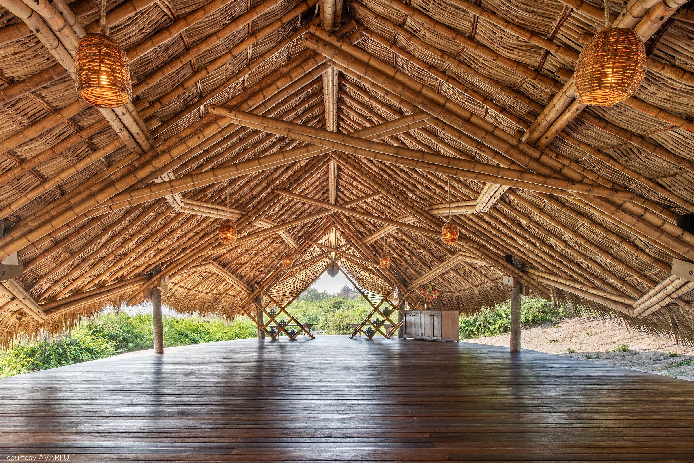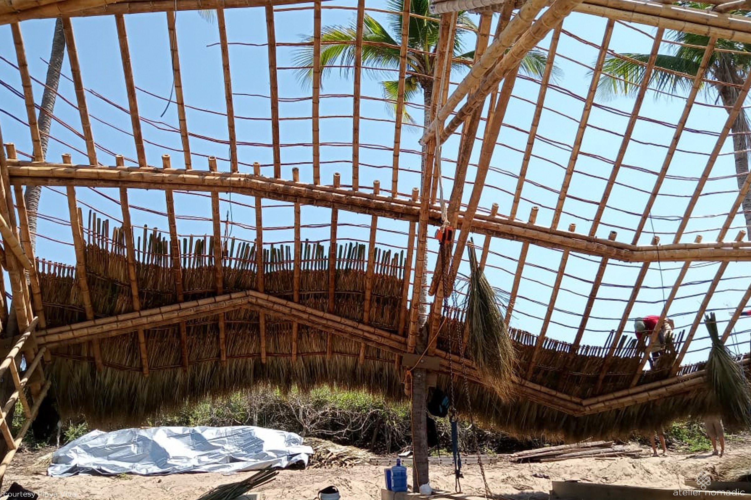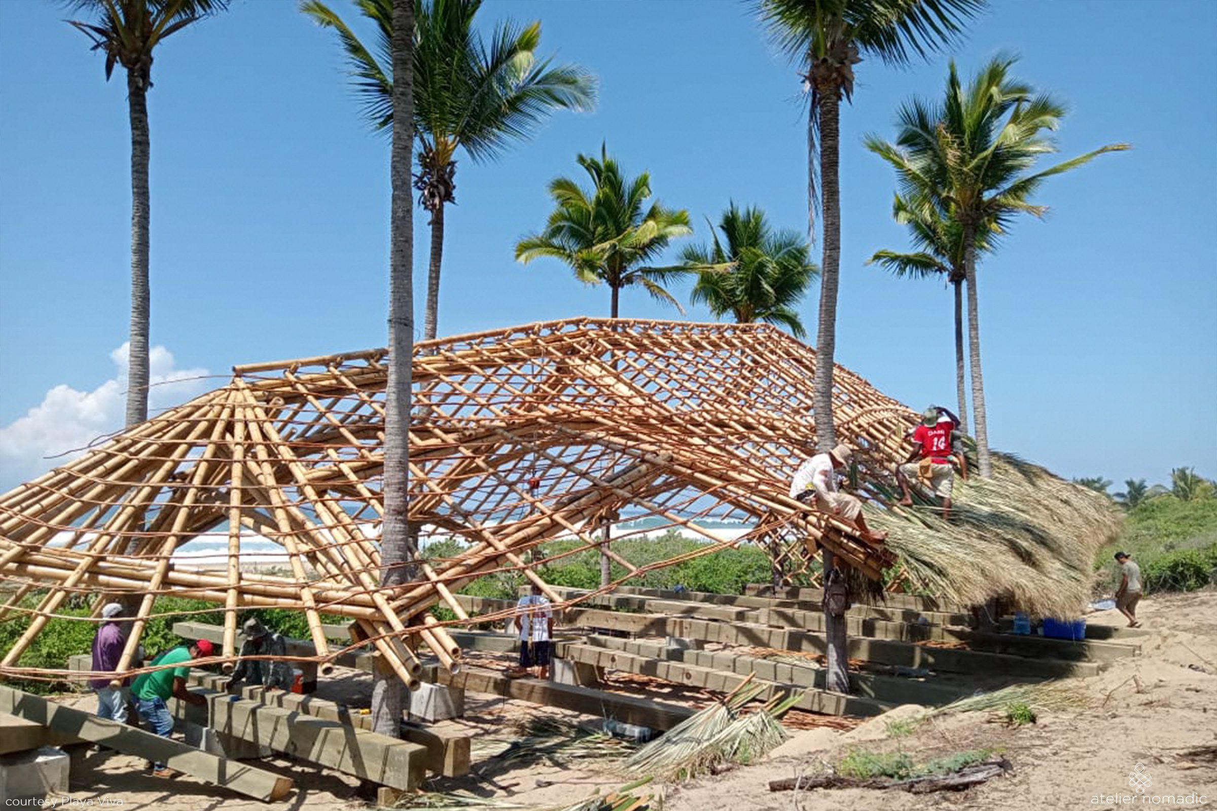 The lightweight bamboo roof structure hovers in mid-air between a cluster of palms reflecting the weightlessness of a swimming turtle as it glides through the ocean. The structure aims to inspire the yoga practitioners beneath with this sense of weightlessness, whilst the shell-like roof structure protects them from sun and rain. The open, naturally ventilated space offers uninterrupted sunset views and a fresh, cleansing ocean breeze. The ideal place to align your chakras.