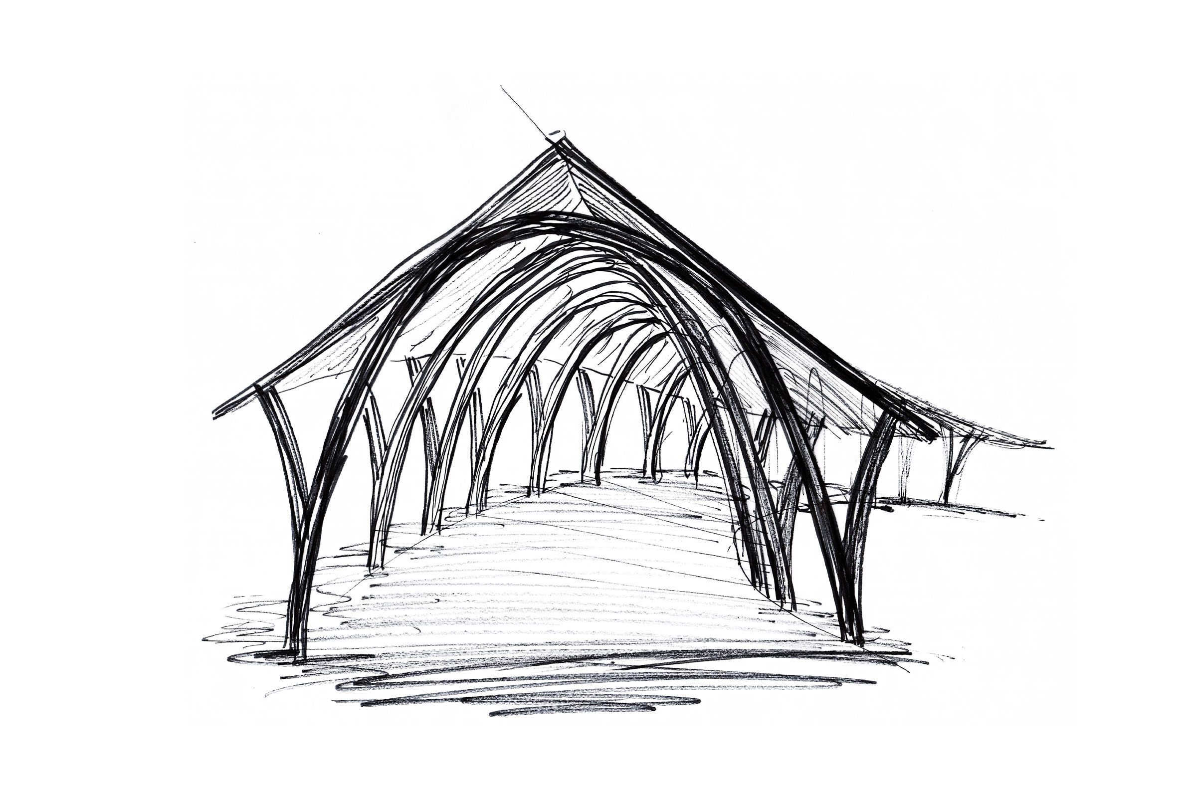 The common facilities are built from traditional materials as adobe and bamboo but in a more organic and contemporary way, creating structures that mimic the endangered Pangolin animal. The laminated bamboo hyperbolic arches are inspired by the elegant brick arches at the attic of Antony Gaudi’s Casa Mila in Barcelona.